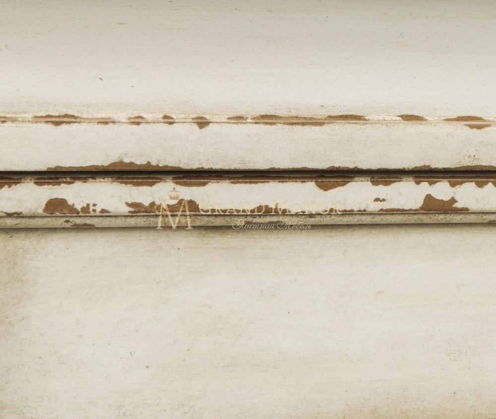 Двухцветная отделка под старину сочетает в себе белоснежное покрытие с потертостями и столешницу с отделкой из состаренного дерева, что придает двойную порцию очарования.