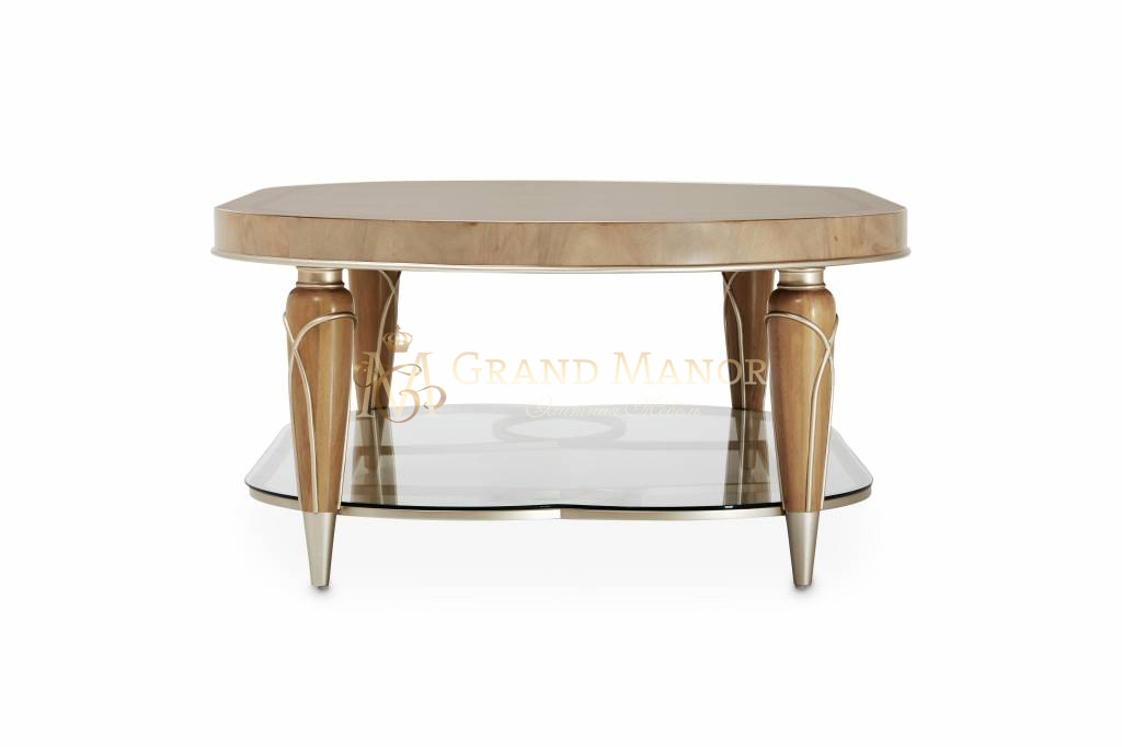 Коктейльный столик имеет предварительно окрашенную раму из красного дерева с карамельной отделкой.