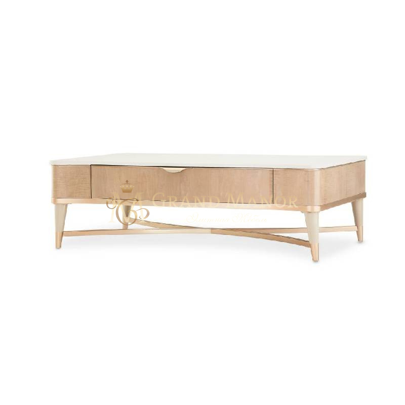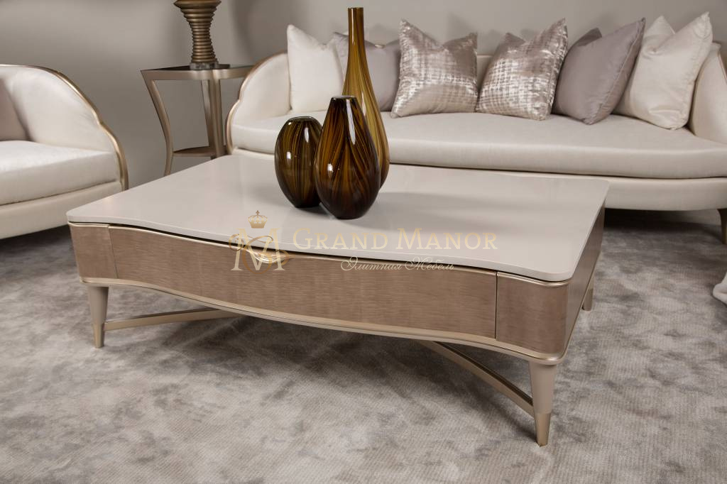 Журнальный столик украшен каркасом из кленового шпона и акцентами шардоне.