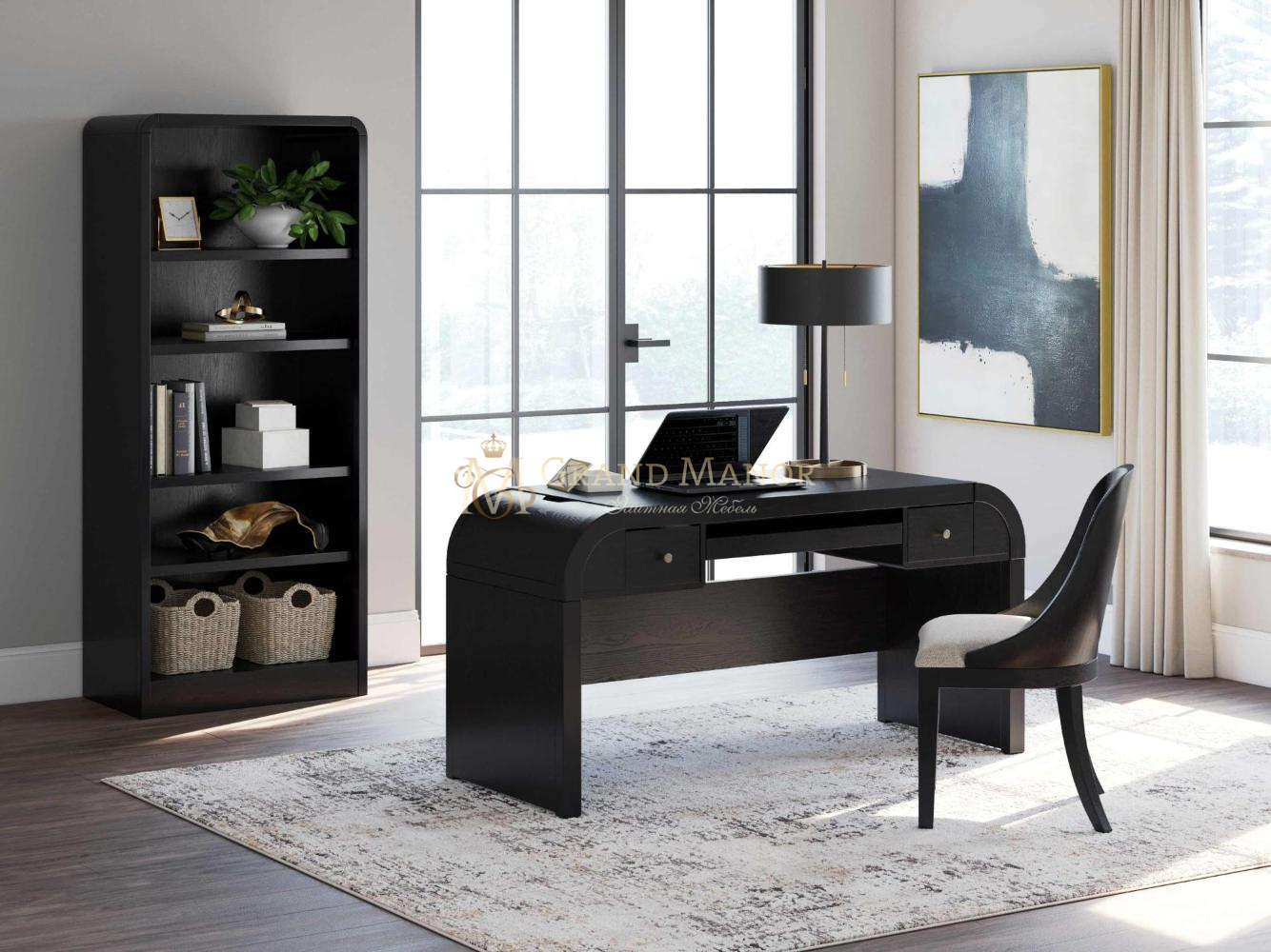 Этот книжный шкаф мягкой формы, вдохновленный дизайном ар-деко, производит неизгладимое впечатление просто потрясающим образом. Его великолепный изогнутый силуэт подчеркивается богатой многослойной черной отделкой на текстурированной поверхности под дерево.