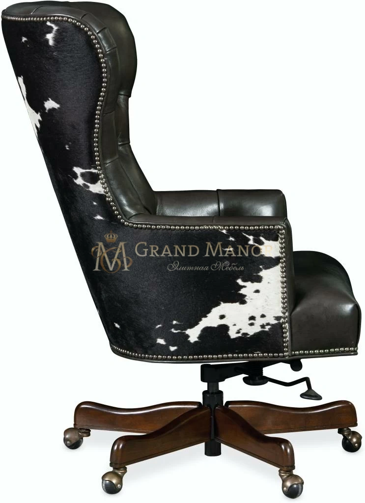 Внешняя поверхность спинки и подлокотников обтянута шкурой черно-белой окраски.