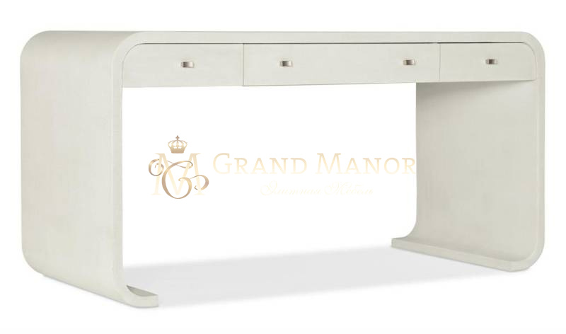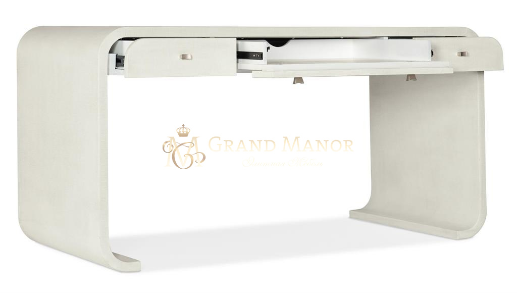 Письменный стол Serenity Bayport с приятной на ощупь органичной поверхностью из белой лакированной ткани, рафии и дерева в кремово-белой отделке Sand Dollar создает непринужденную атмосферу.