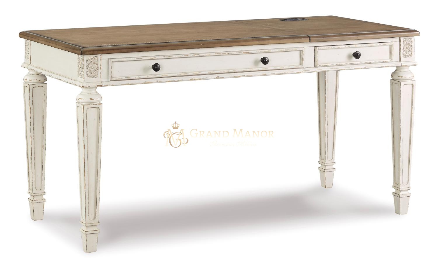 Возвышая искусство традиционного стиля коттеджа, этот стол станет вашим райским домашним офисом. Двухцветная эстетика под старину сочетает в себе белоснежный цвет с верхом цвета состаренного дерева для дополнительного очарования. Фасады выдвижных ящиков в рамке, декоративные выступы и изящно изогнутые и заостренные ножки добавляют изысканности, а ручки цвета темной бронзы придают классический вид.