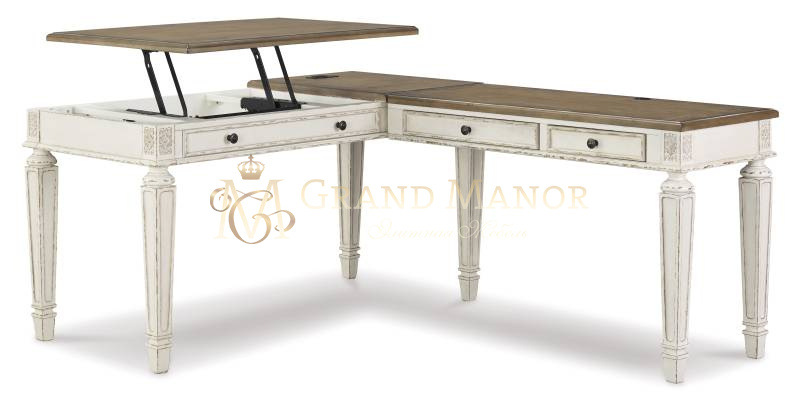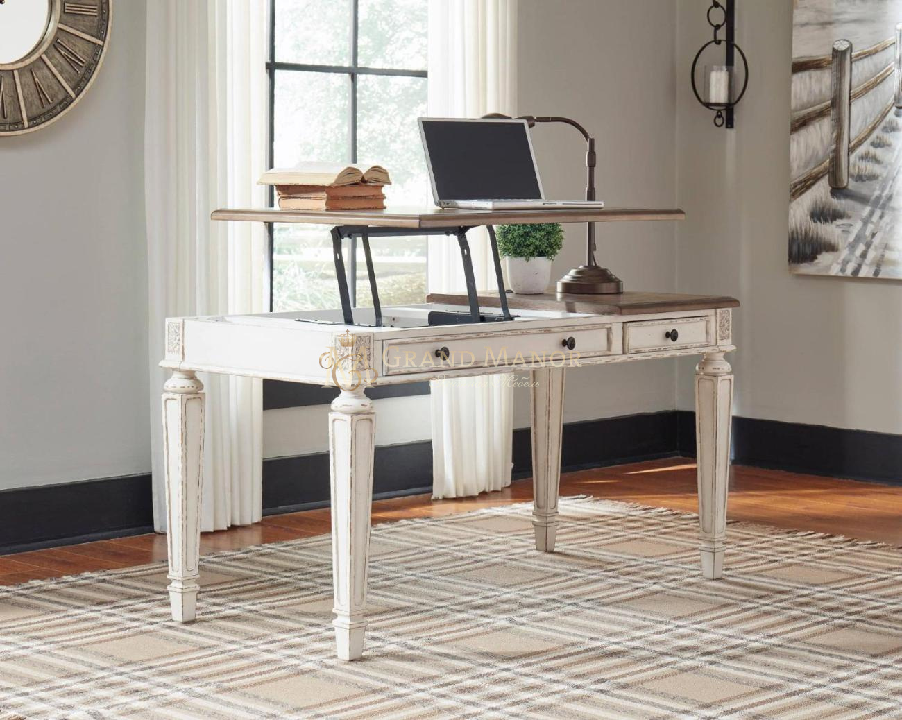Возвышая искусство традиционного стиля коттеджа, этот стол станет вашим райским домашним офисом. Двухцветная эстетика под старину сочетает в себе белоснежный цвет с верхом цвета состаренного дерева для дополнительного очарования. Фасады выдвижных ящиков в рамке, декоративные выступы и изящно изогнутые и заостренные ножки добавляют изысканности, а ручки цвета темной бронзы придают классический вид.