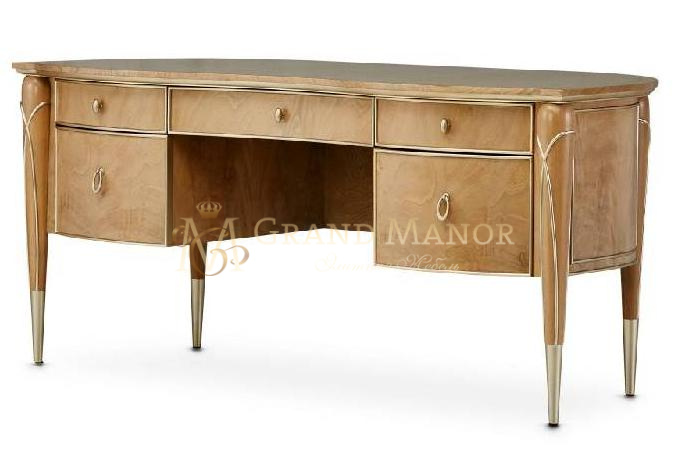 Письменный стол Villa Cherie органично сочетает в себе функциональность и стиль. Ящики, обшитые бархатом, и широкая рабочая поверхность подчеркивают практичность, а шикарные акценты цвета шардоне, изысканная окантовка и шпон из красного дерева с завитками выделяют это изделие из толпы.