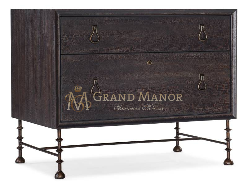 Комод, изготовленный из шпона ореха Гикори и металла с окантовкой из массива дерева, оснащен двумя выдвижными ящиками.