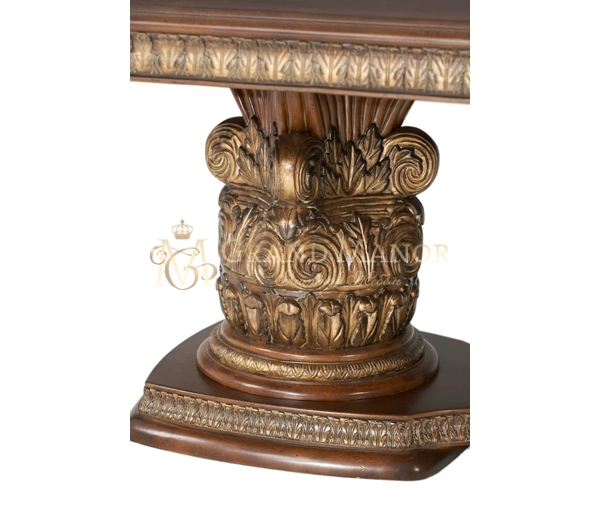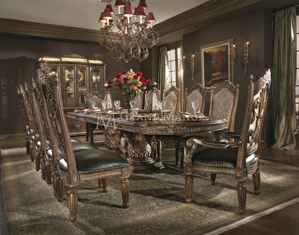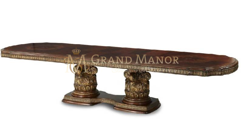 Соберитесь вокруг прямоугольного обеденного стола Villa Valencia и насладитесь его мастерским исполнением. Замысловатая резьба по всему этому великолепному изделию сразу же навевает мысли о тосканском винограднике на берегу Средиземного моря. Две сложные подставки, поддерживающие стол, массивны и богато украшены. Этот прямоугольный обеденный стол с тремя вставками подходит для больших семейных собраний и званых ужинов.