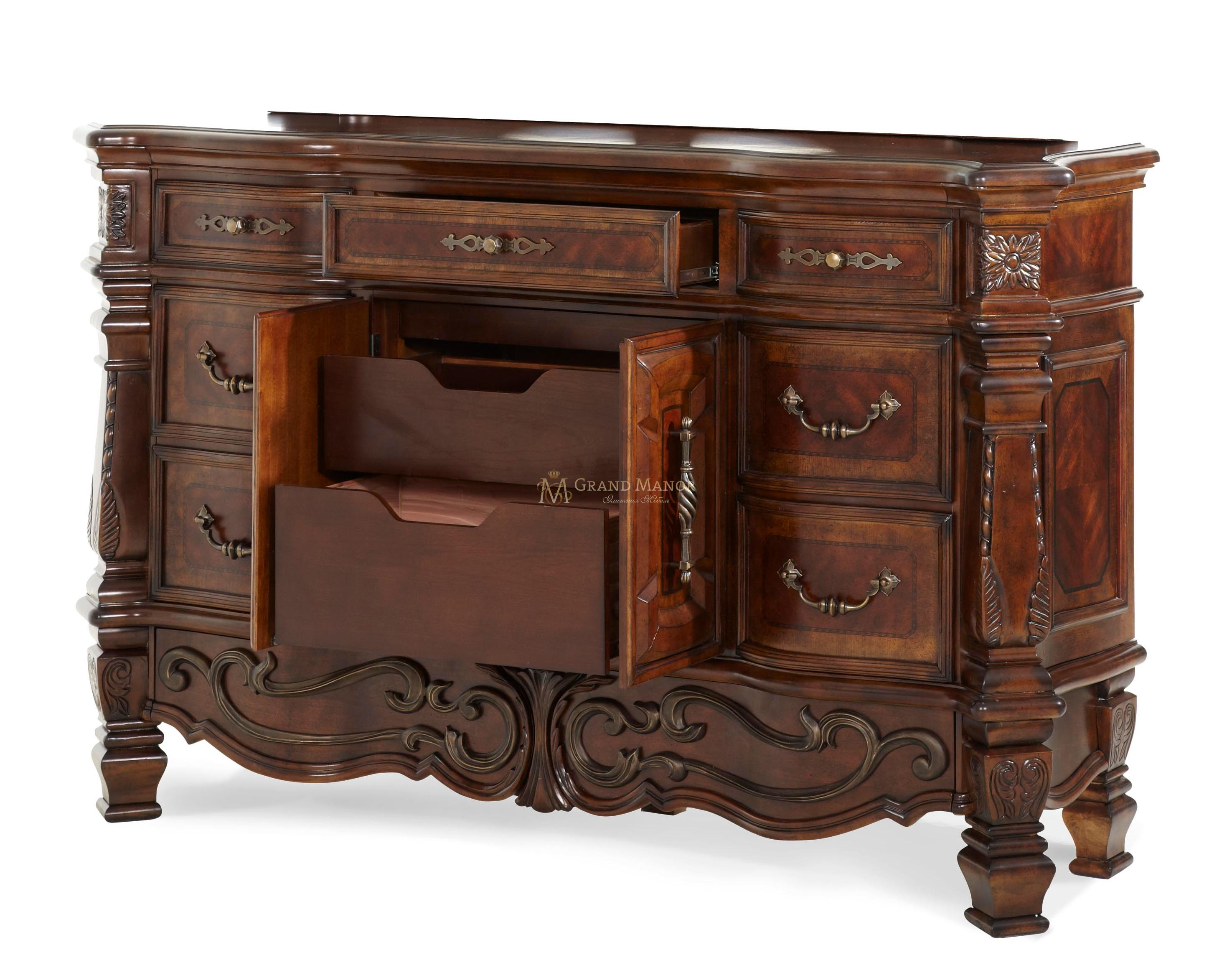 Комод оснащен 7 ящиками, обшитыми бархатом.