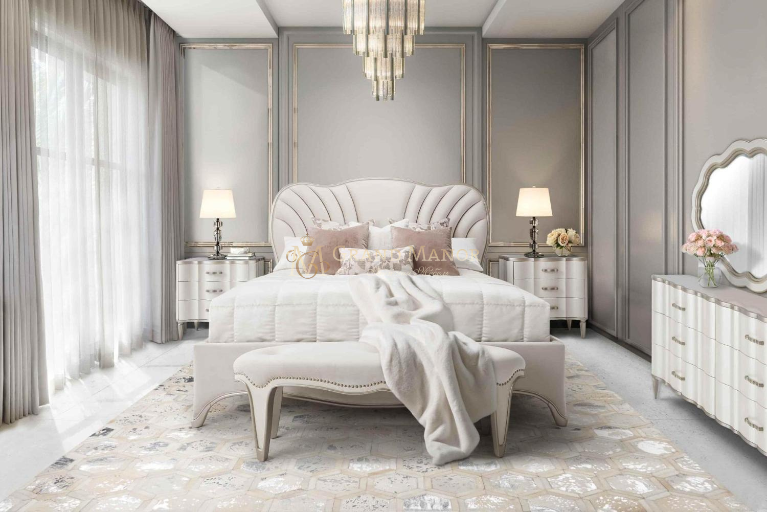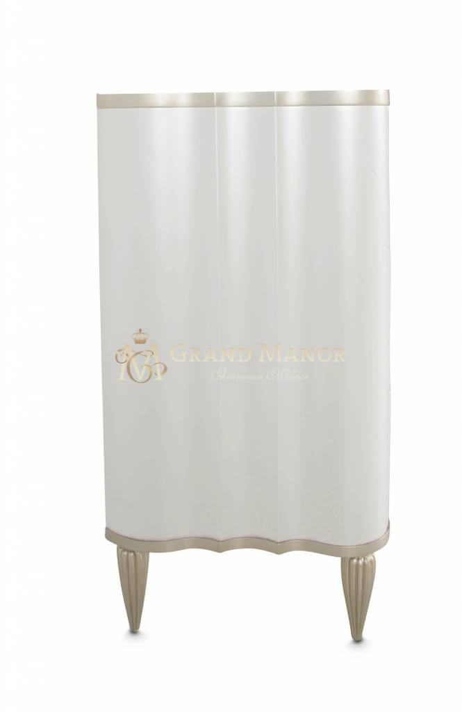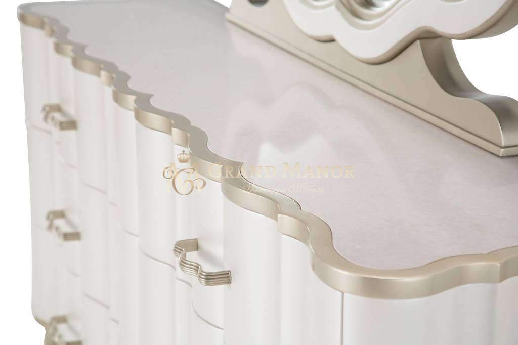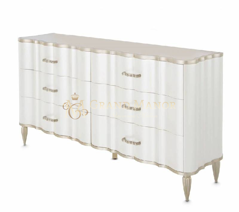 Комод имеет рельефный дизайн с кремово-перламутровой отделкой.