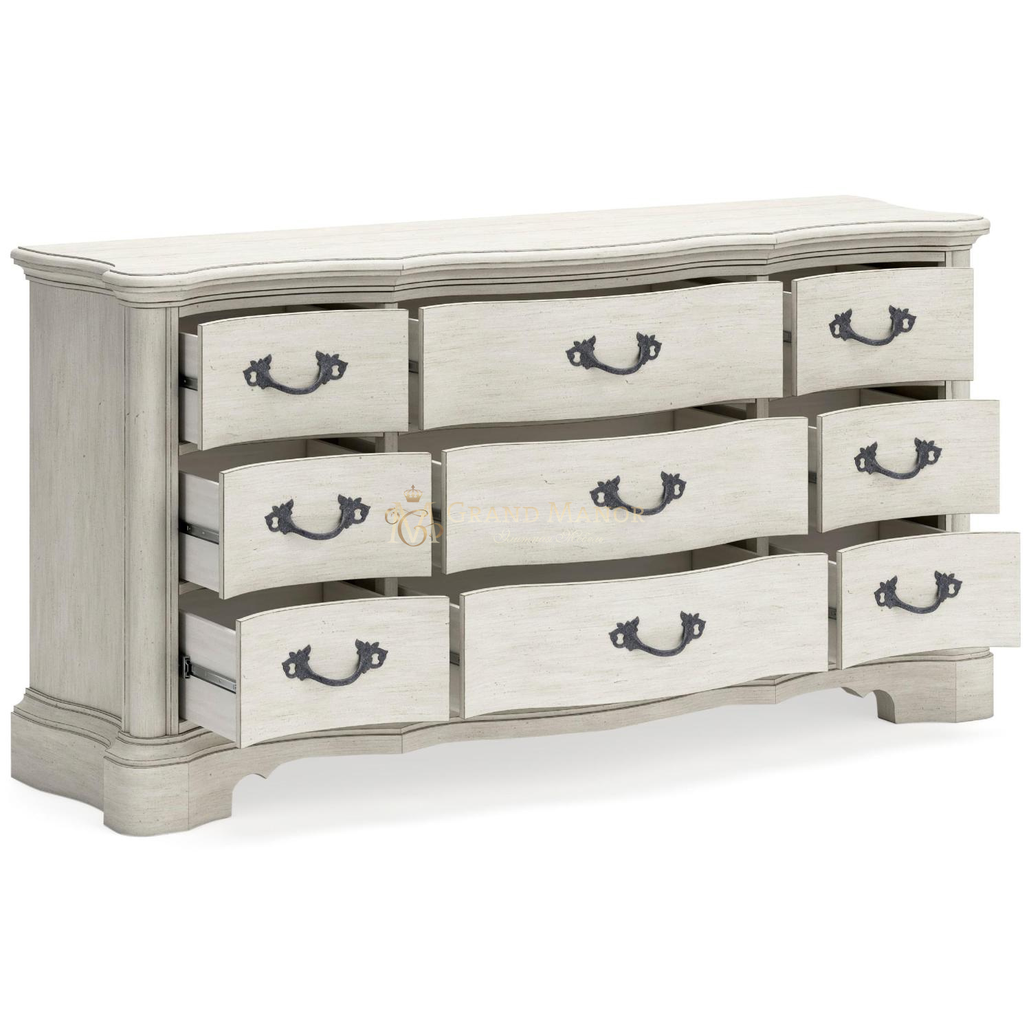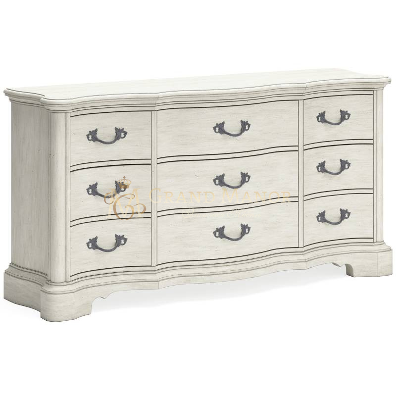 Добавьте нотку романтики в свою спальню с помощью этого комода. Его отделка, окрашенная в старинный белый цвет, и детали изогнутого силуэта олицетворяют непринужденную элегантность.