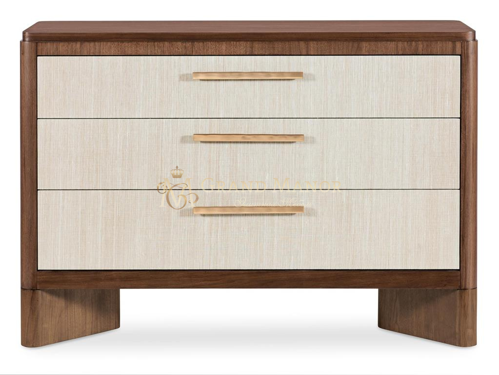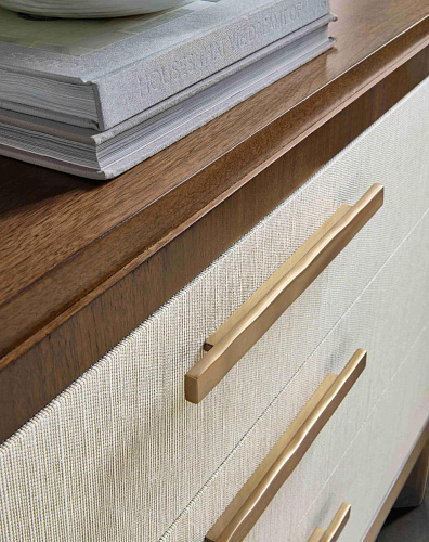 Комод Eleana с тремя выдвижными ящиками отличается изысканным дизайном с использованием светло-карамельного шпона орехового дерева, фурнитуры из позолоченной бронзы и фасадов выдвижных ящиков, обтянутых бежевой тканью, что придает им текстурированный, естественный вид.