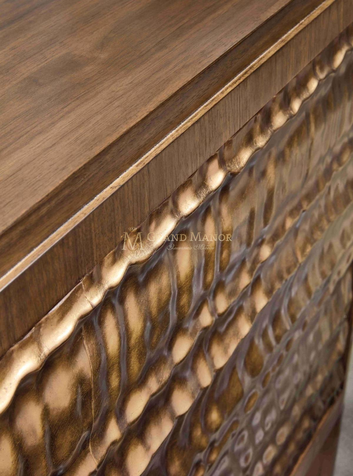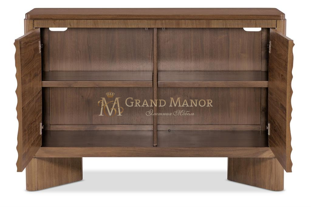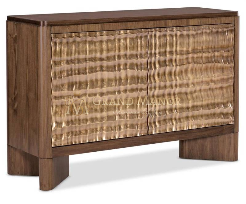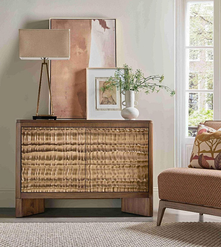 Придайте своему жилому пространству современный вид с помощью двухдверного комода Eleana, отделанного светло-карамельным шпоном грецкого ореха, и скульптурных бронзовых дверных фасадов, подсвеченных солнцем.