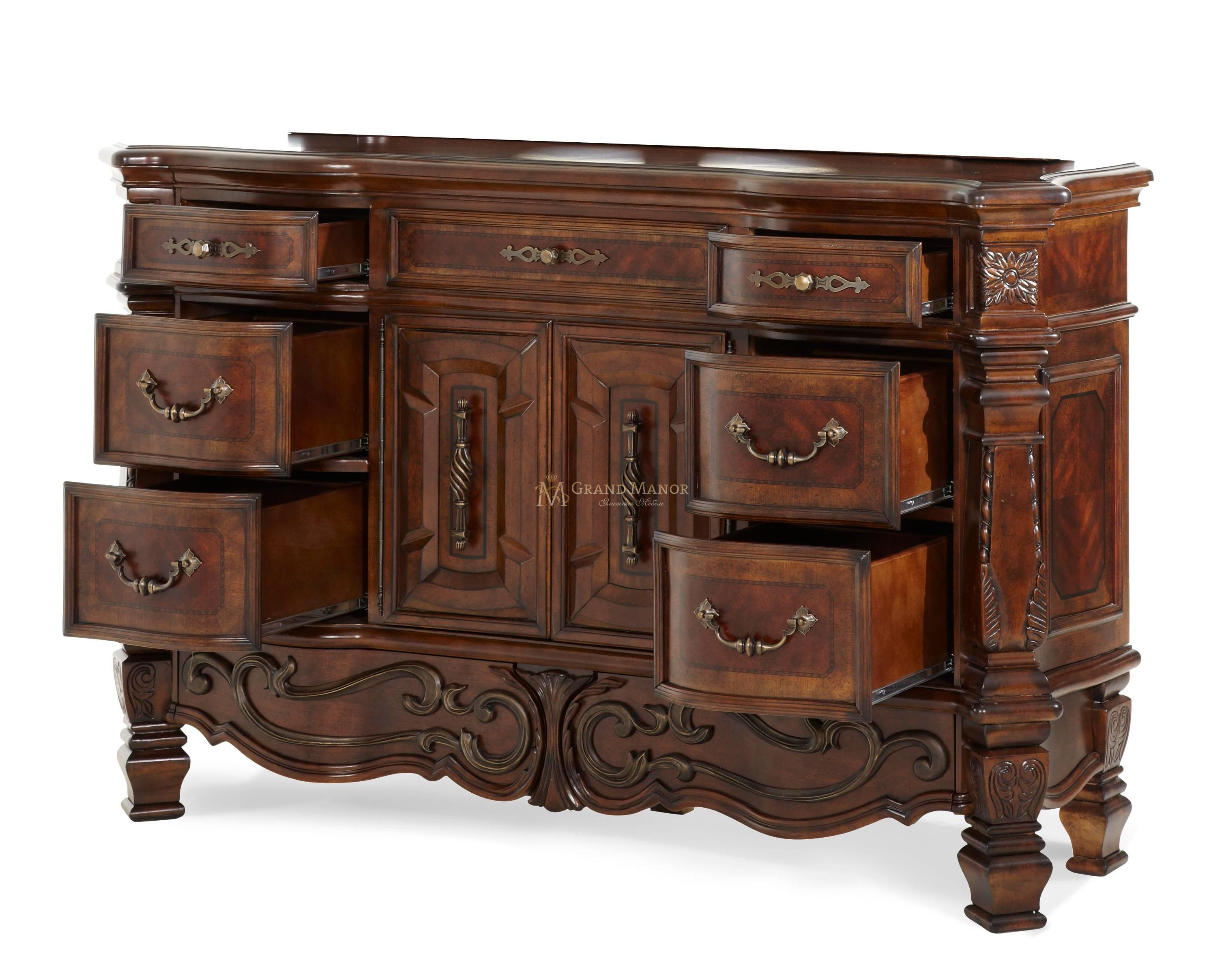 Комод оснащен 7 ящиками, обшитыми бархатом.
