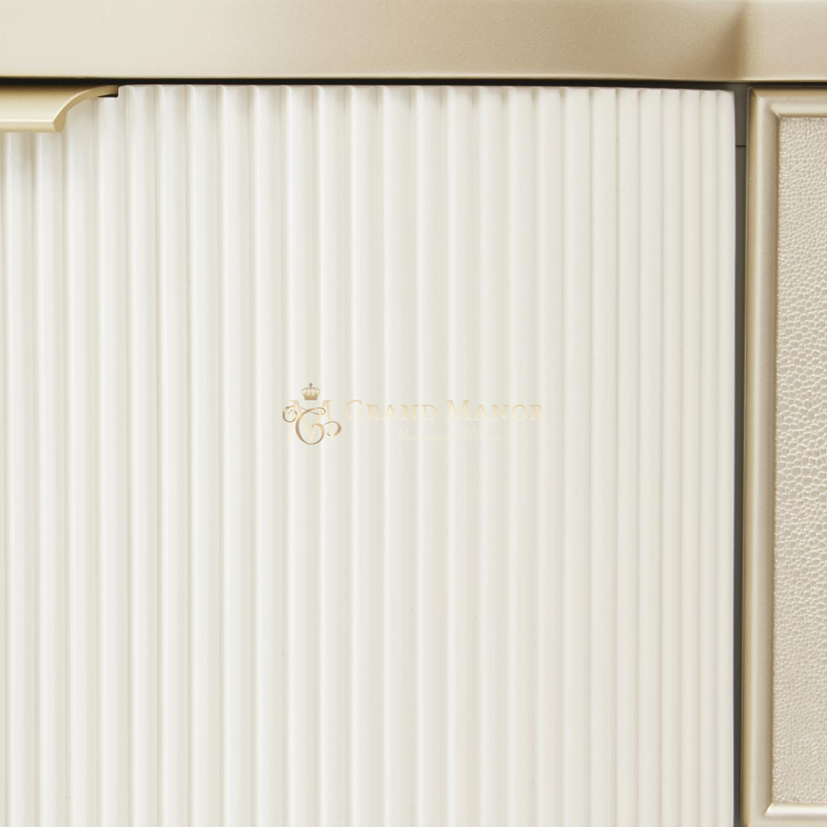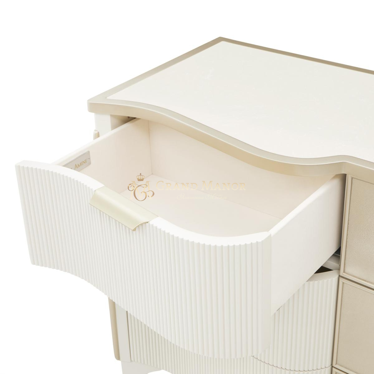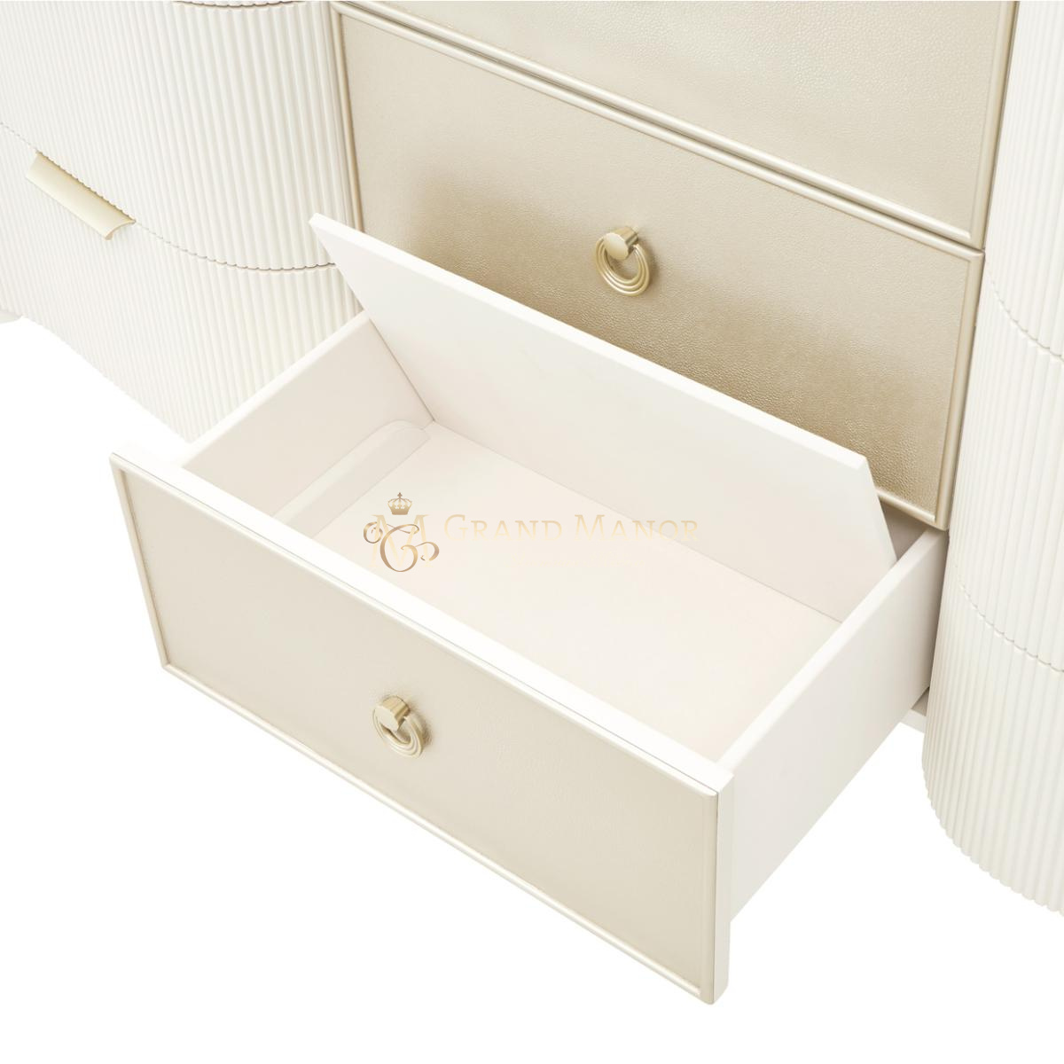 Фактурные детали, такие как ребристые боковые панели и фасады ящиков из искусственной шагрени, создают изысканный контраст. Девять отделанных бархатом ящиков с мягким закрыванием обеспечивают достаточно места для хранения самых необходимых предметов гардероба.