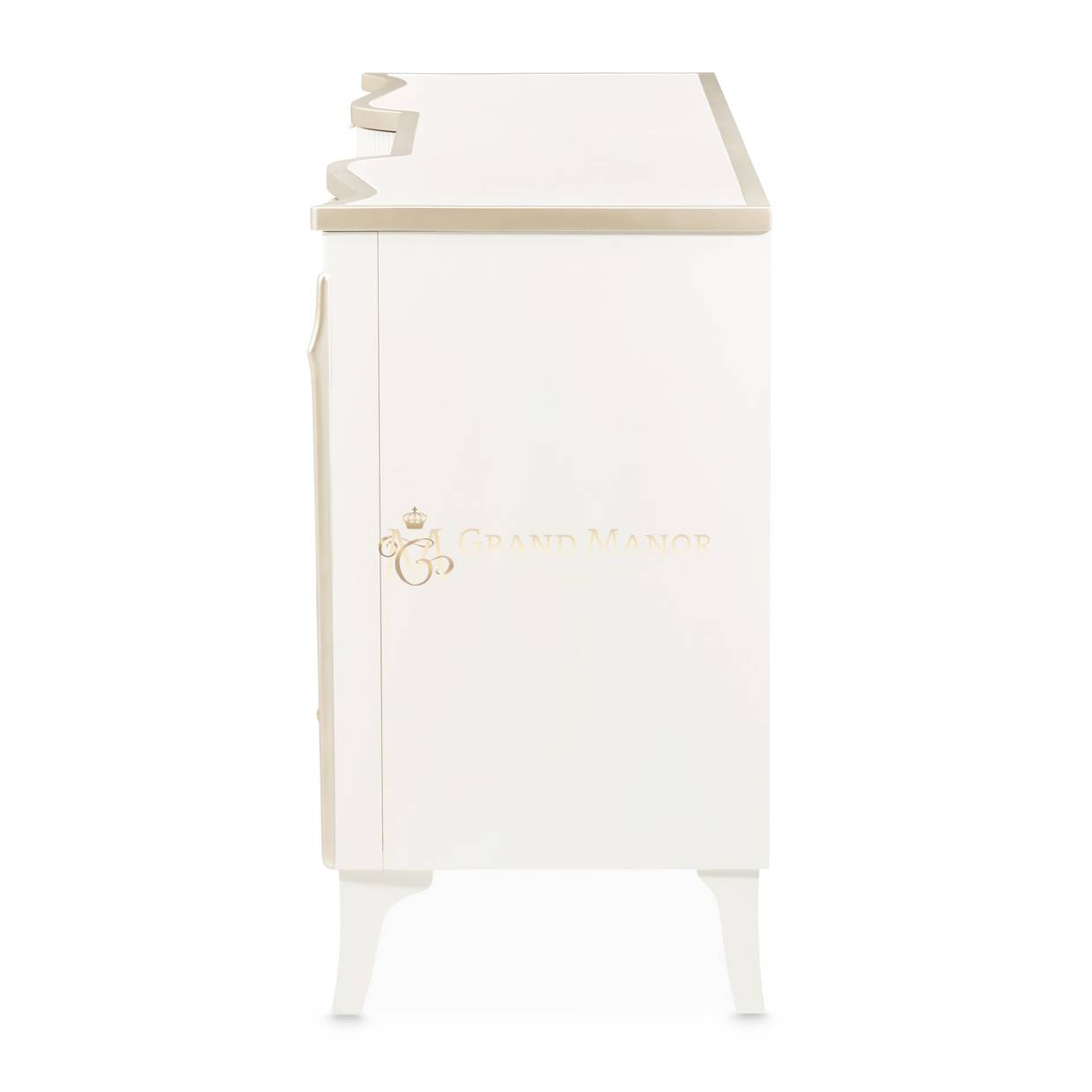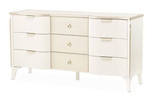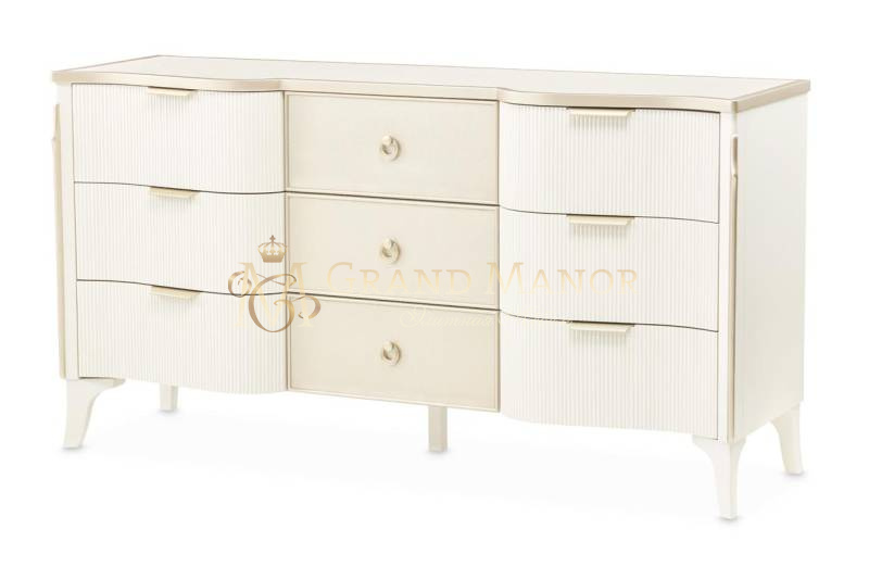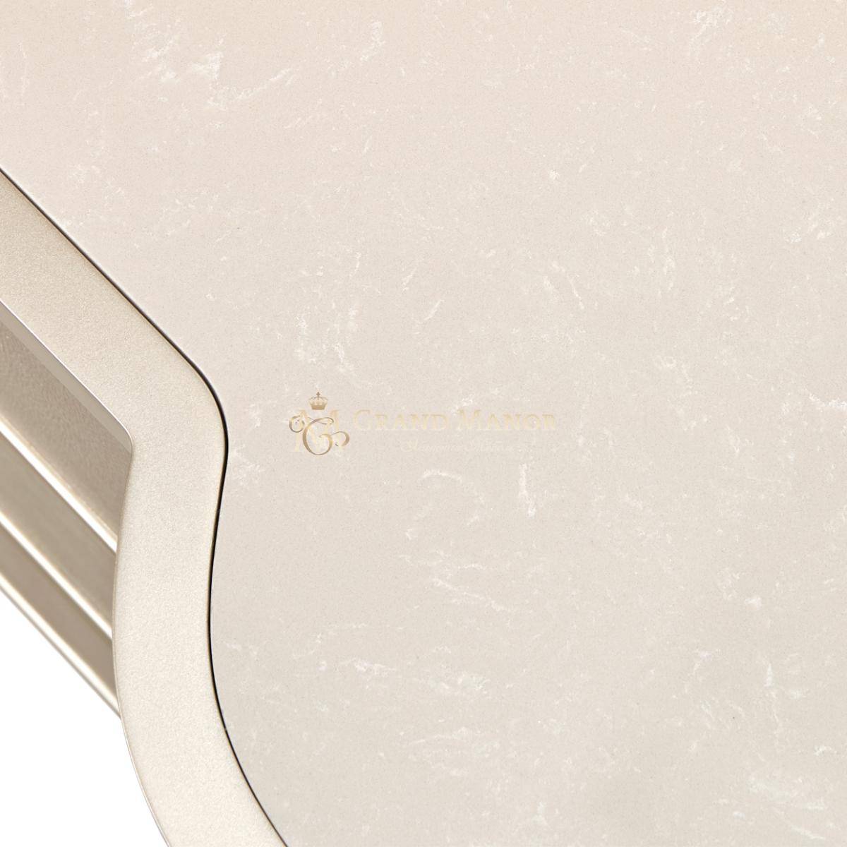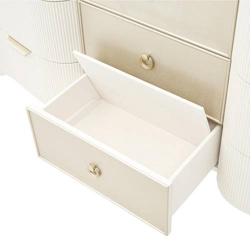 Комод La Marisia — это уникальное сочетание элегантности и функциональности, способное привнести атмосферу роскоши в любую спальню. Его утонченный силуэт подчёркивают перламутровые акценты и цвет шампанского, а столешница из искусственного мрамора придаёт изделию отполированный вид.