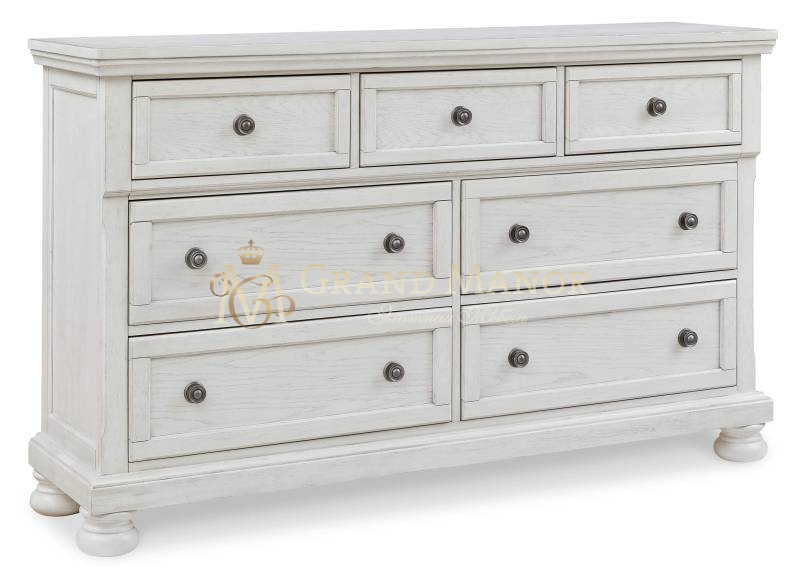 Белая отделка под старину с прекрасной зернистой текстурой излучает изысканность, а фурнитура темного бронзового цвета добавляет стиля. Скрытый выдвижной лоток за верхним средним ящиком скроет ваши мелкие ценности от глаз. Верхние ящики с войлочной отделкой завершают образ спальни, создающей неповторимый стиль.