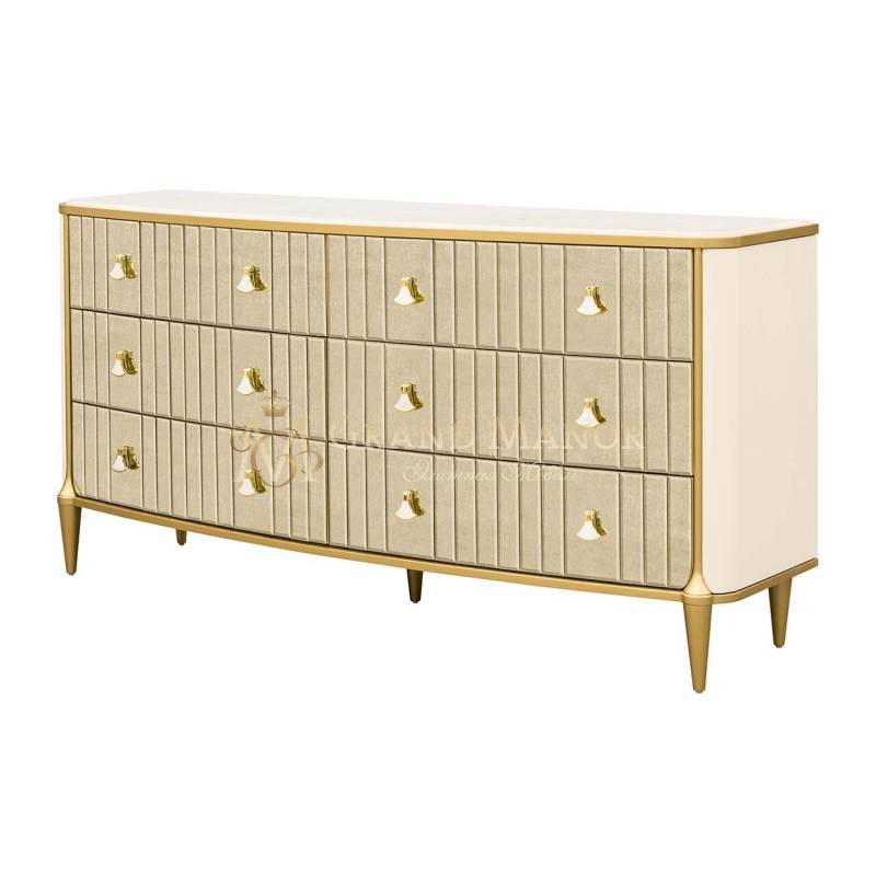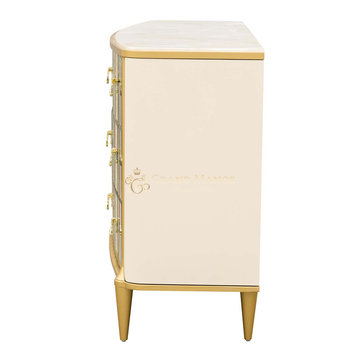 Комод Scotts Square — это воплощение роскоши. Его гладкая поверхность цвета светлого шампанского обрамлена сияющим золотом. Антикварные зеркальные фасады выдвижных ящиков с изящными скошенными краями создают эффект мерцания при каждом взгляде. Столешница из оникса придает комоду особую изысканность и подходит для демонстрации ваших любимых предметов декора.