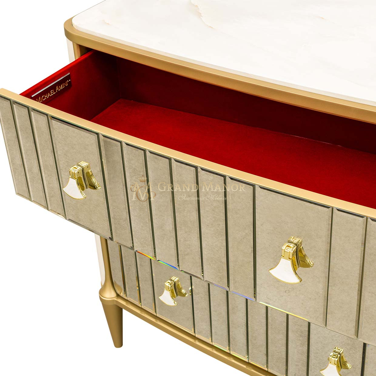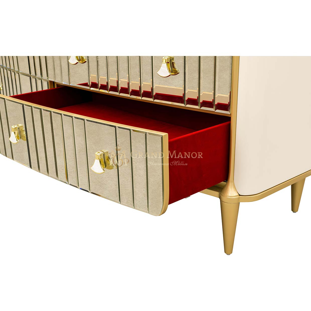 Внутри комода — выдвижные ящики с мягким закрыванием. Они полностью обшиты красным бархатом, что создает уютное и элегантное пространство для вашего гардероба и аксессуаров. Потайные боковые шкафчики с бархатными лотками для украшений и деликатных вещей добавляют функциональности и шарма. В нижнем ящике предусмотрено потайное отделение, что делает комод еще более удобным.