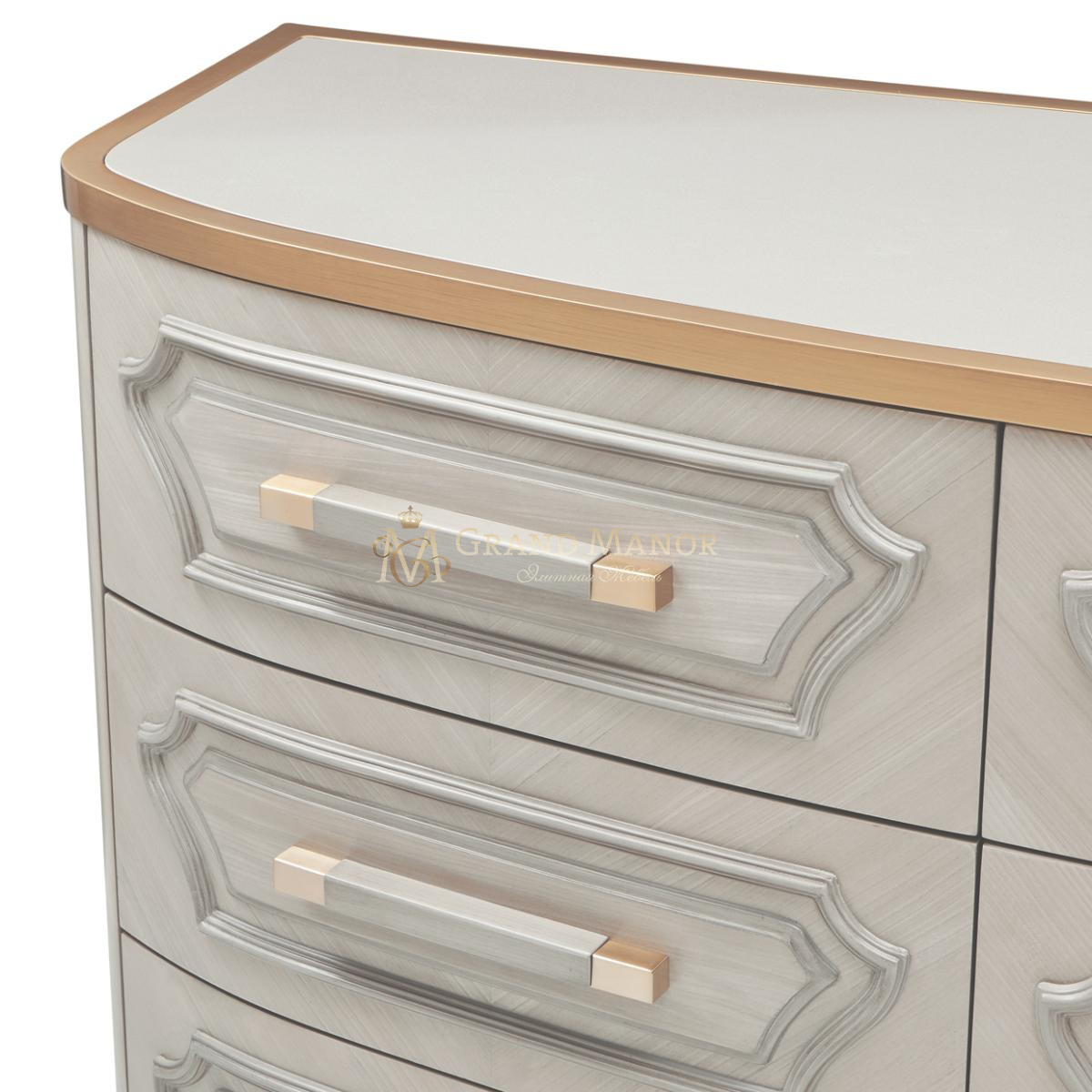 Вместительный комод Saint Charles с девятью выдвижными ящиками - это воплощение элегантности, дополненное столешницей с мраморной инкрустацией. Голубовато-серая отделка и шпон Sen воплощают роскошь, делая его незаменимым предметом изысканного вкуса.