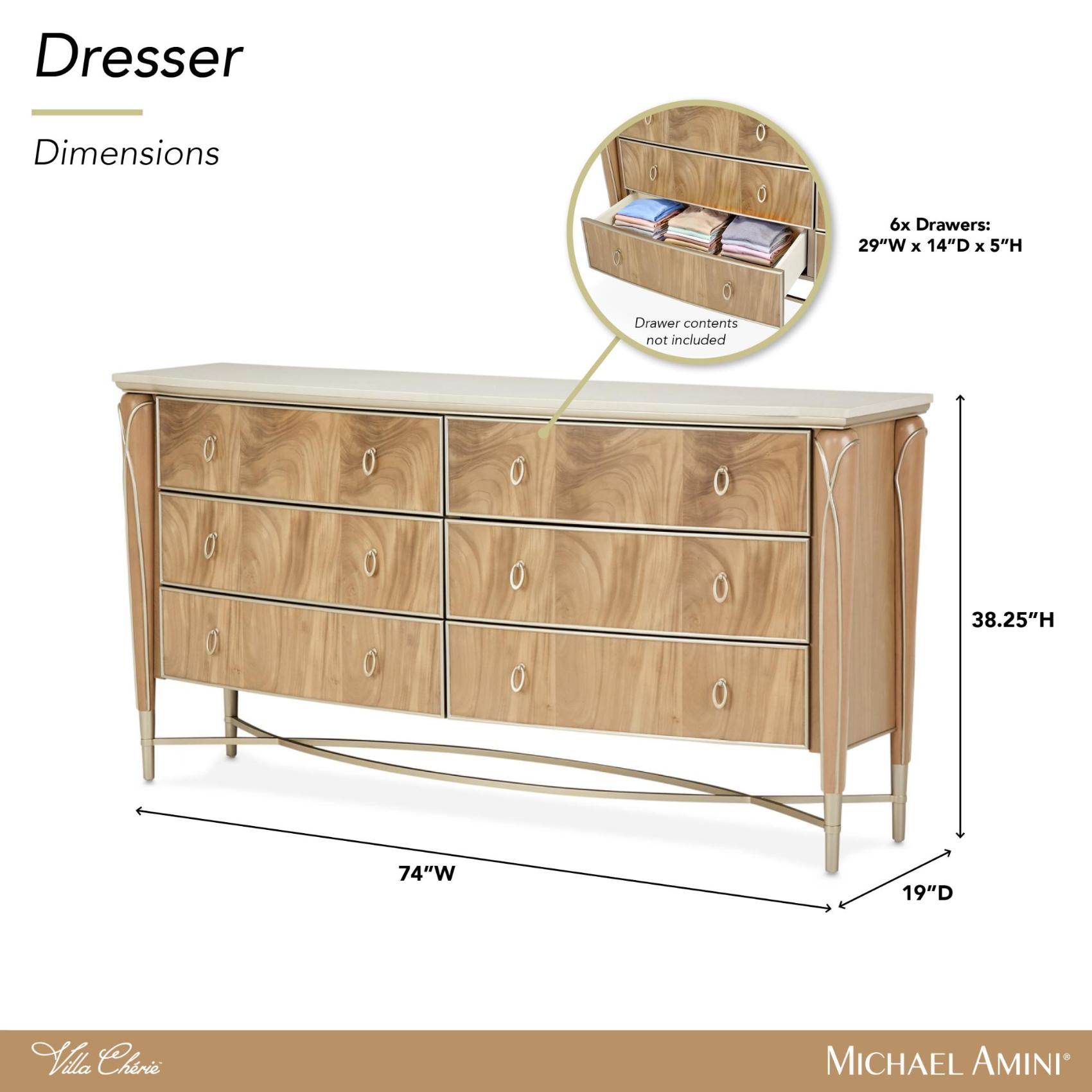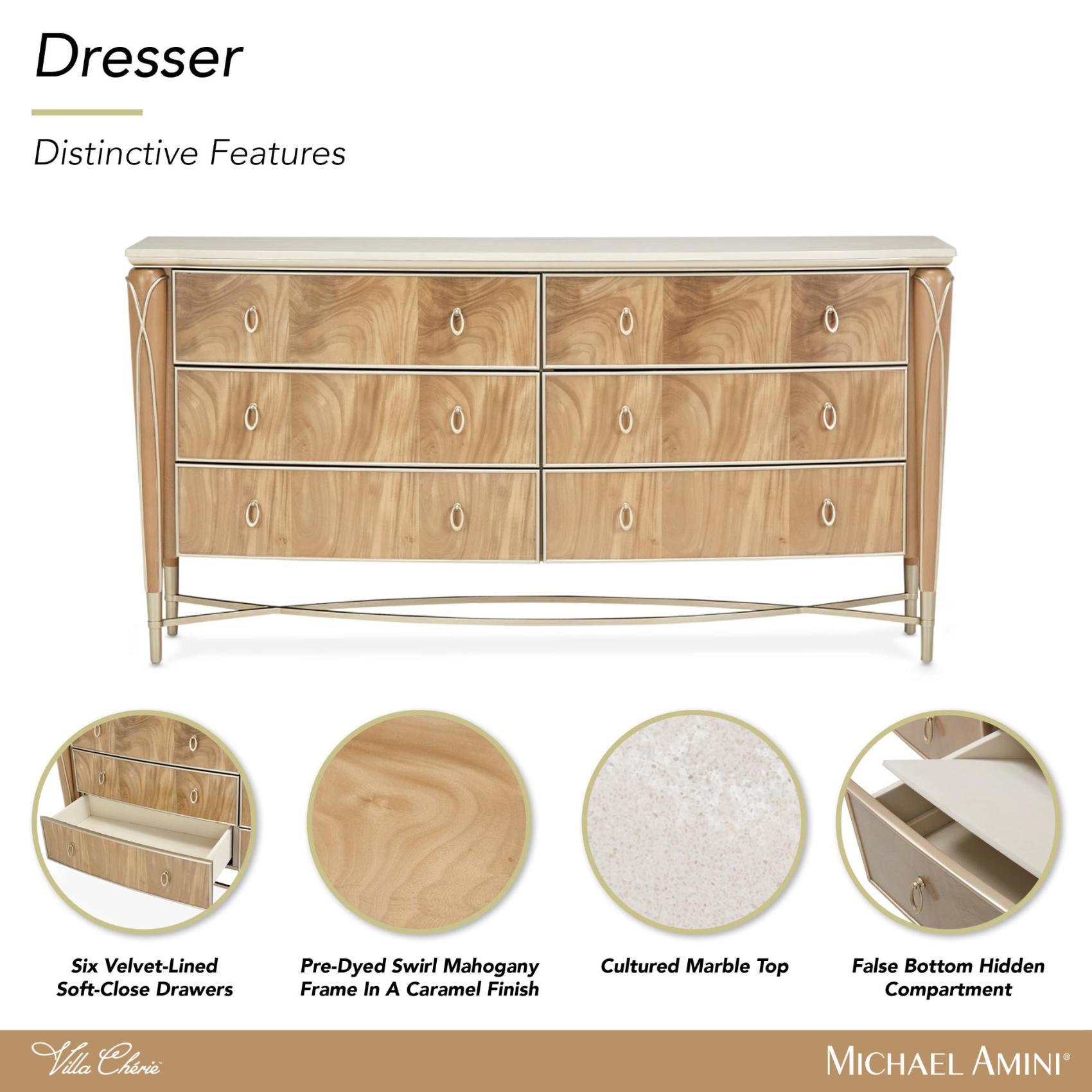Найдите элегантность в каждой детали с комодом Villa Cherie. Благодаря изящной форме передней панели, размашистым акцентам и скрытому хранилищу на бархатной подкладке это изделие создает прекрасное пространство для одежды, аксессуаров и декора.