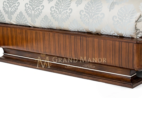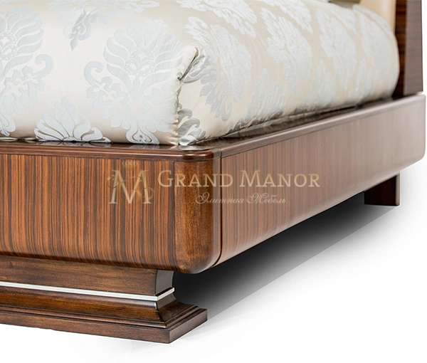 Каркас выполнен из 100% массива березы, красивая и качественная обивка выполнена из 100% кожи. Для исполнения шпона используют эбеновое дерево и мадрону. Эти компоненты – огромный плюс! Ведь это свидетельствует о том, что кровать выполнена из натуральных и экологически чистых материалов. Дизайнеры постарались на славу: высокое изголовье обито 100% кожей и украшено зеркально-стеклянными вставками, а у изножья декором служат металлические элементы.