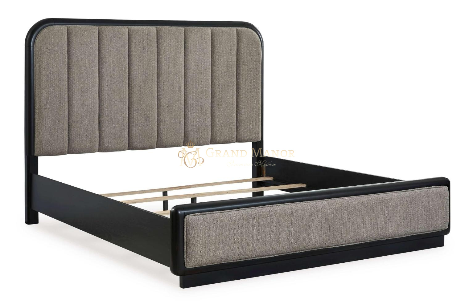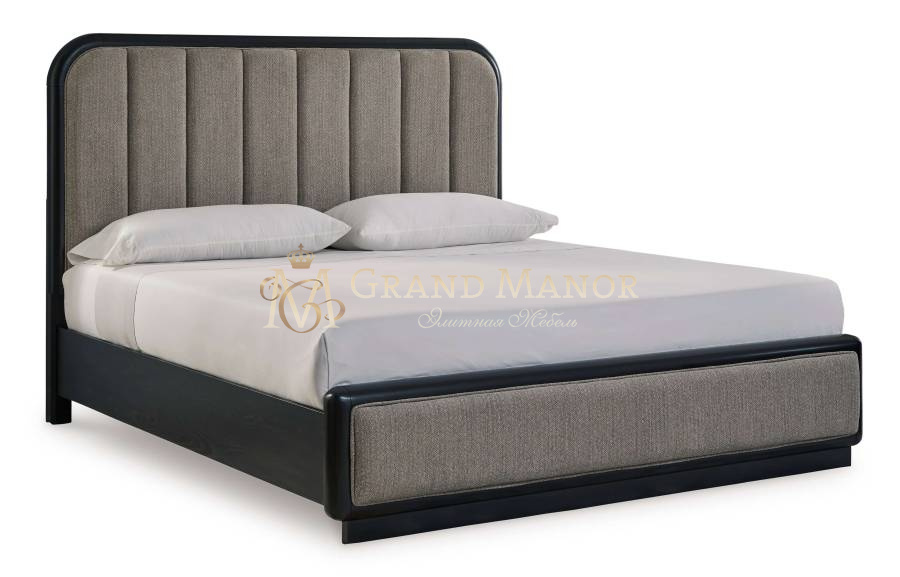 Эта двуспальная кровать с мягкой обивкой, вдохновленная дизайном ар-деко, производит неизгладимое впечатление просто потрясающим образом. Её великолепный изогнутый силуэт подчеркивается богатой многослойной черной отделкой на текстурированной поверхности под дерево. Профильное вертикальное изголовье и изножье, обернутое текстурированной обивкой «елочка», объединяет форму и функциональность.