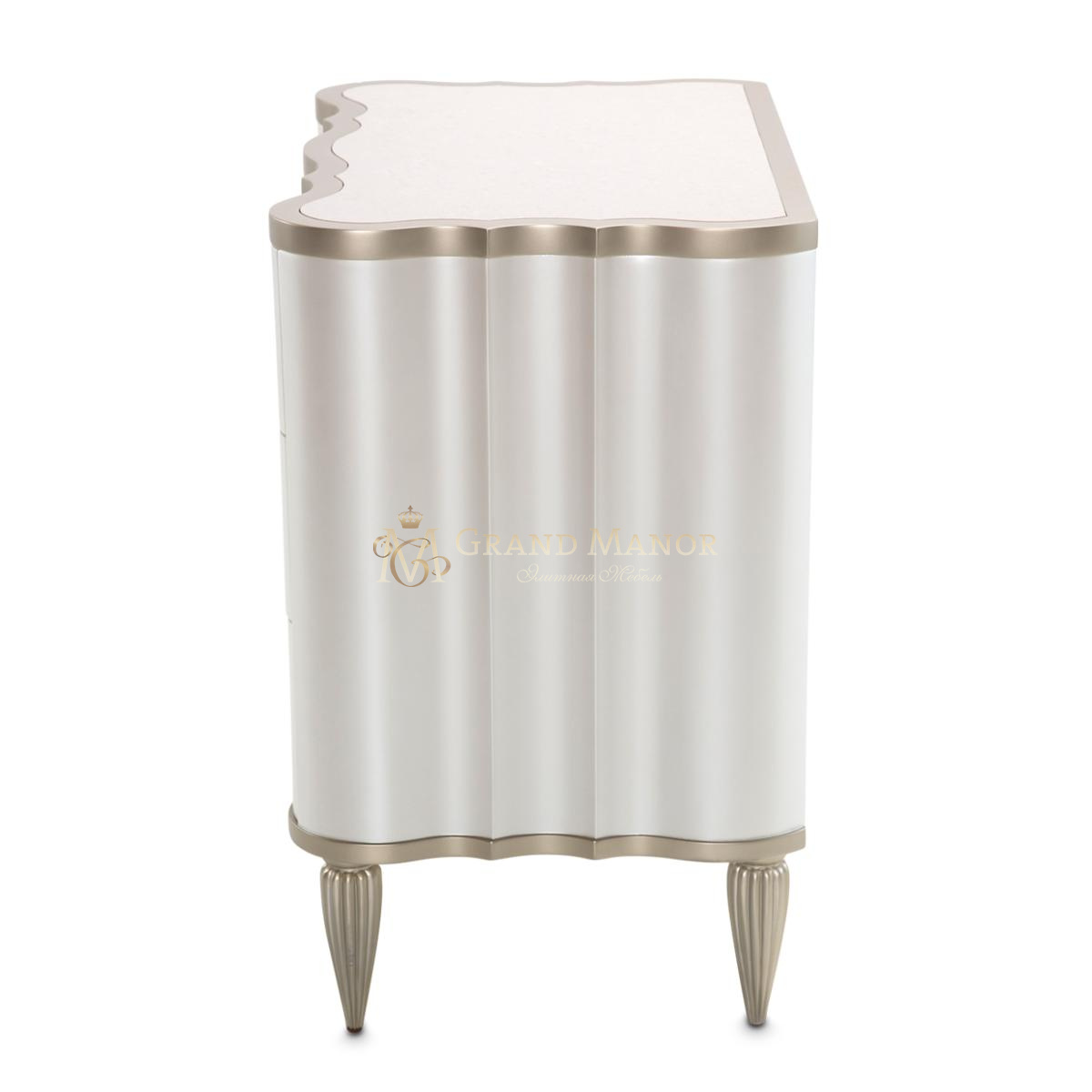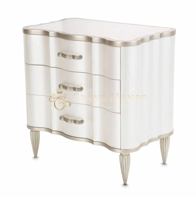 Прикроватная тумбочка имеет рельефный дизайн с кремово-перламутровой отделкой.