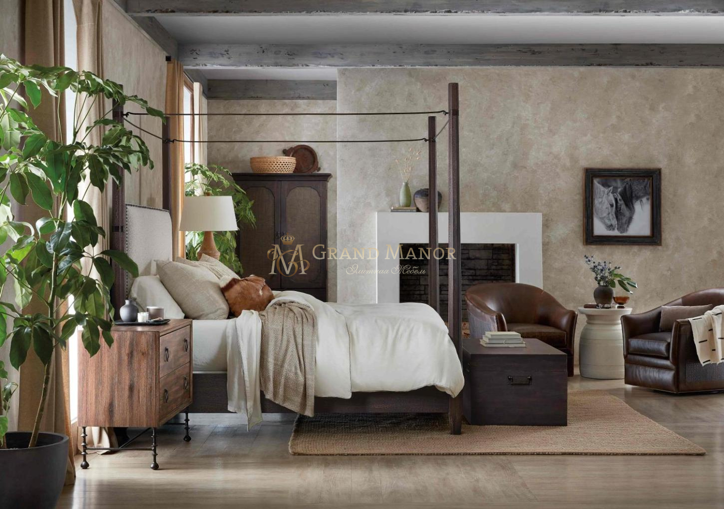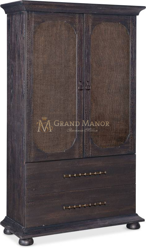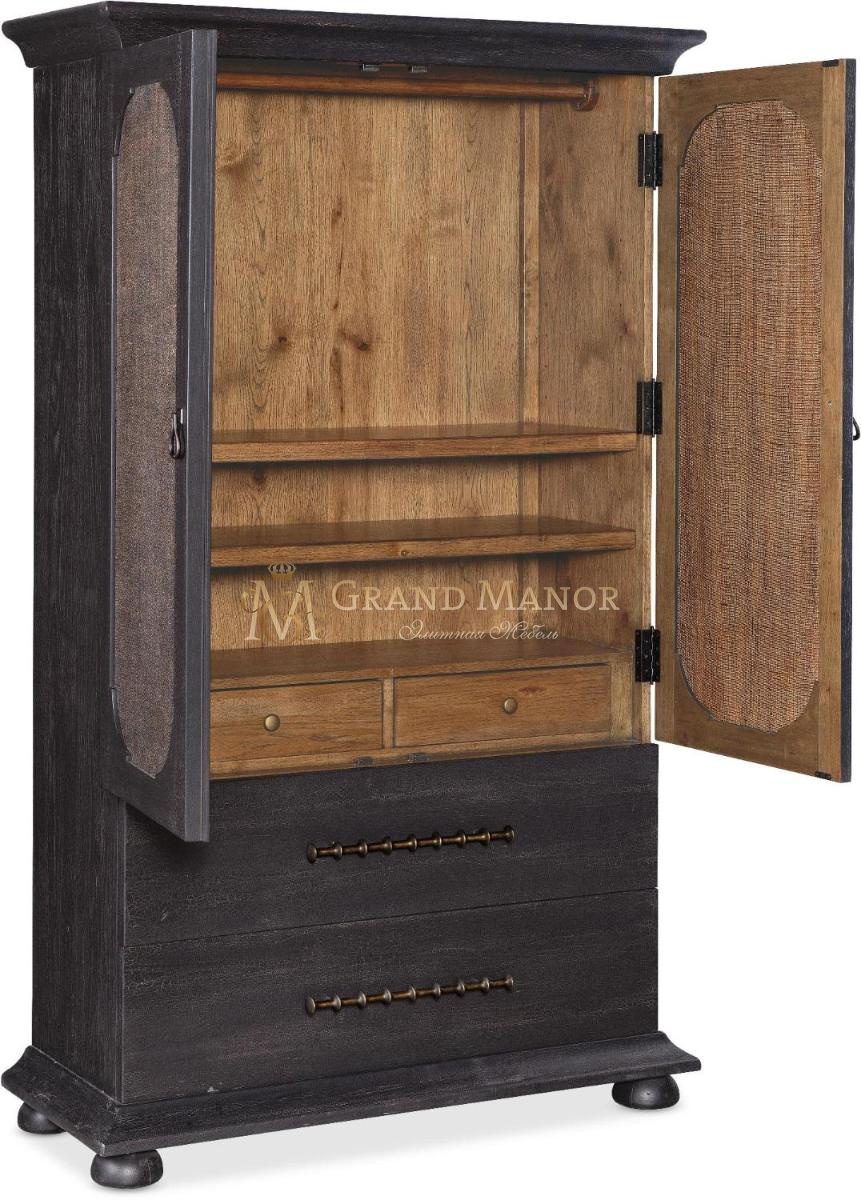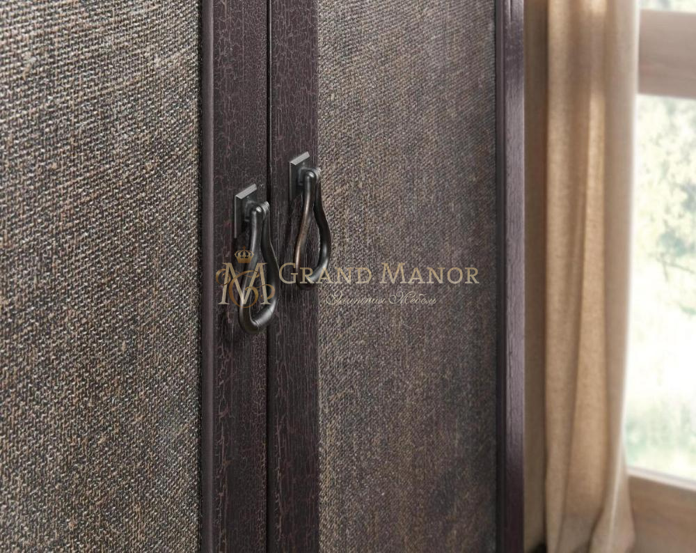 Шкаф-купе Big Sky Small, привлекающий внимание тактильными ощущениями и выполненный в винтажном стиле, поражает отделкой из черного обожженного дерева, облицованного шпоном ореха гикори, который контрастирует с отделанной мешковиной на фасадах дверей.