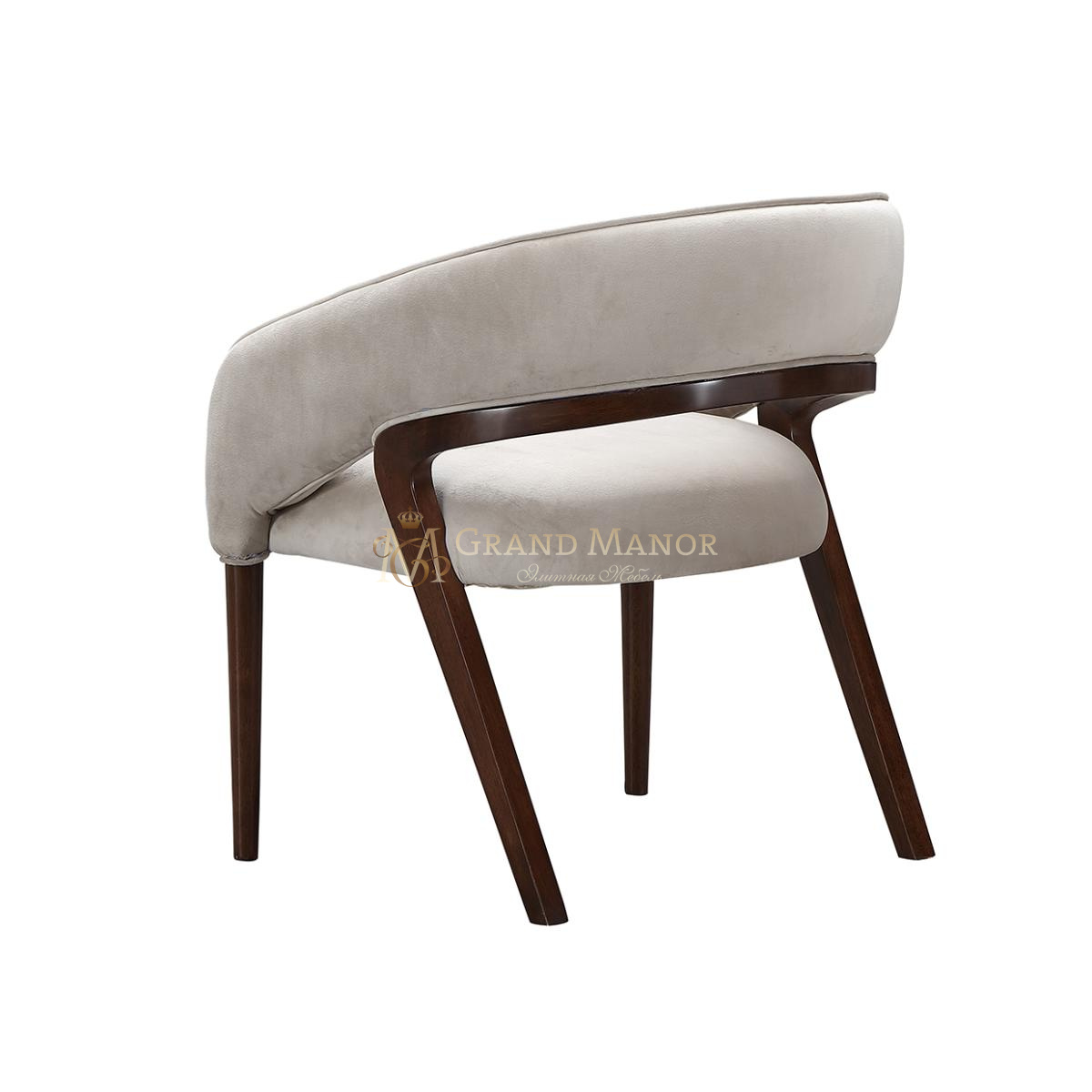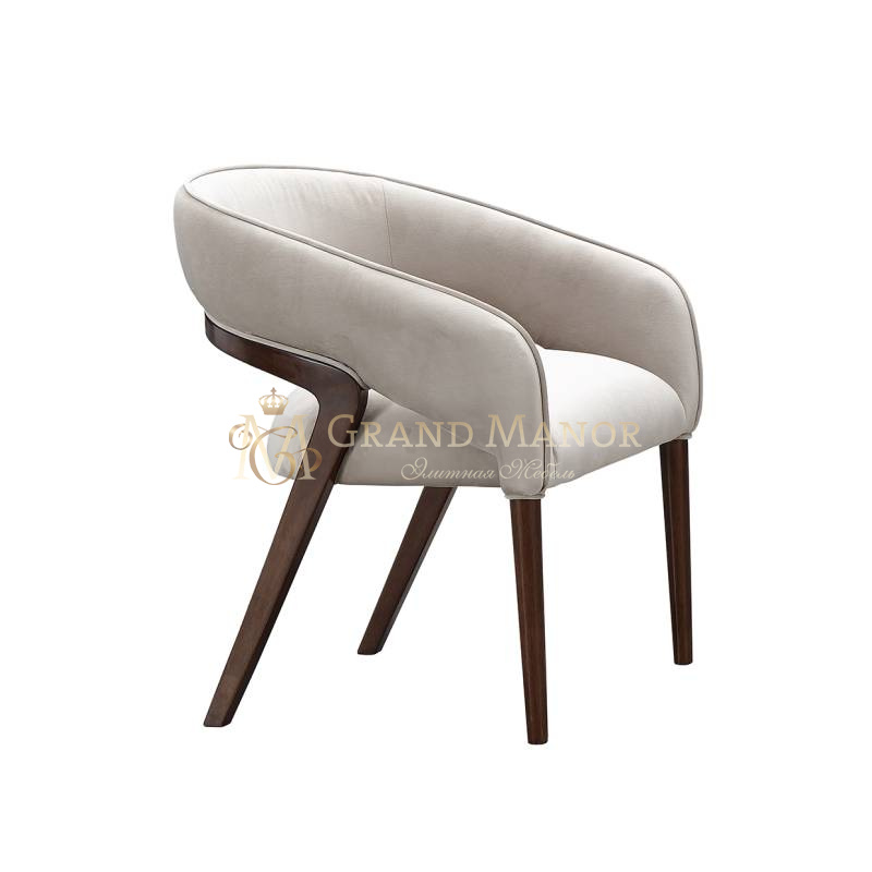 Скульптурный дизайн с округлой спинкой создает изящно изогнутый силуэт. Плюшевая бархатная обивка серого цвета создает мягкое и манящее ощущение. Каркас из дерева с отделкой из теплого ореха создает изысканный контраст, что усиливает его утонченную привлекательность.