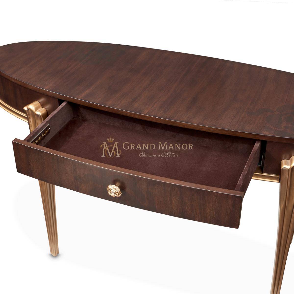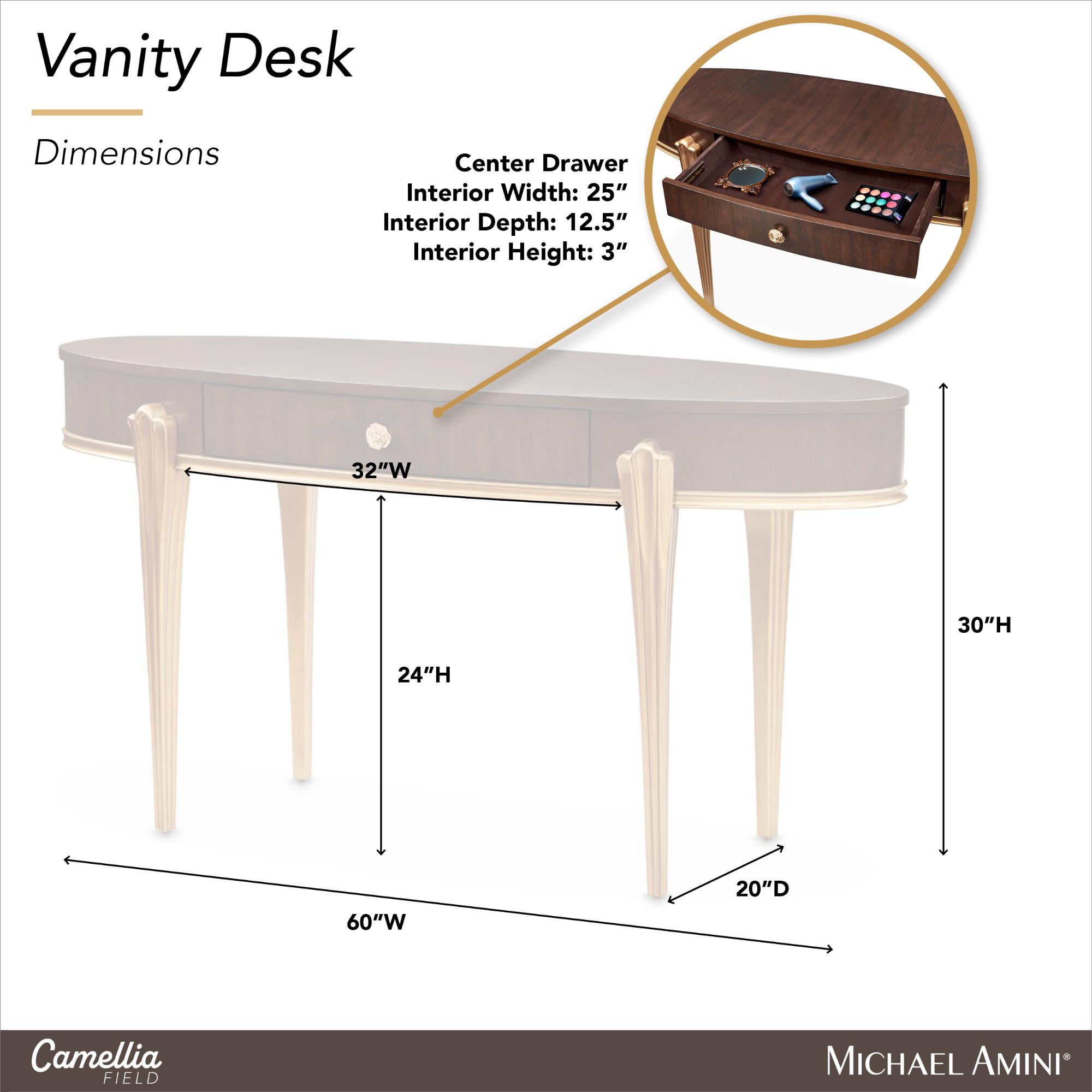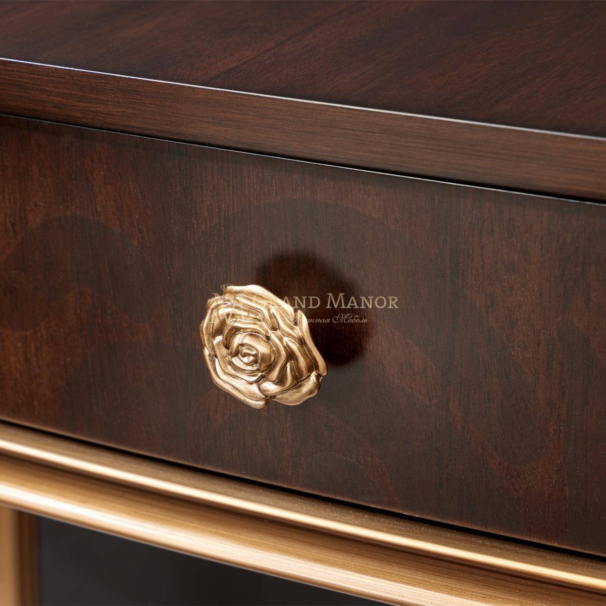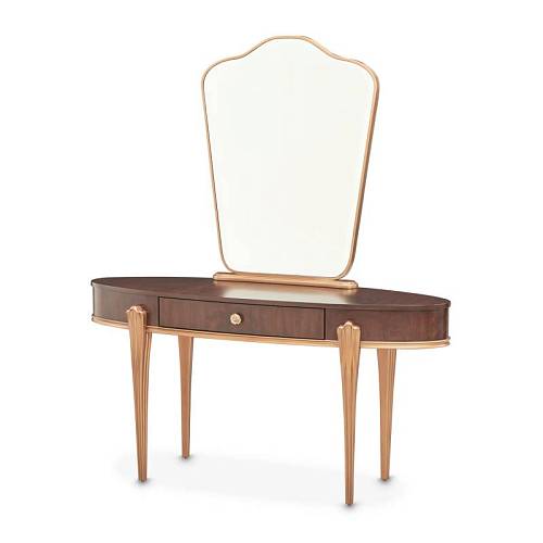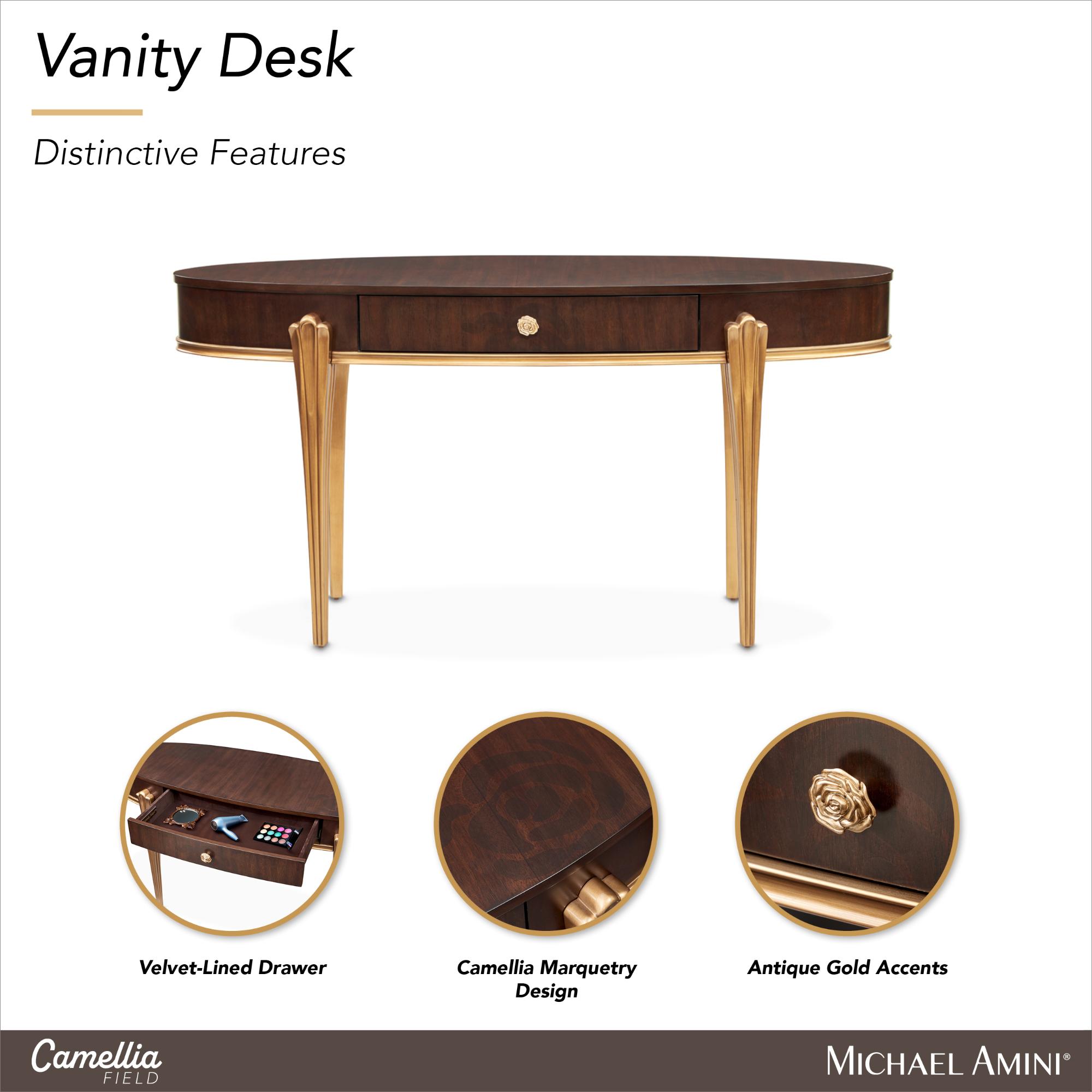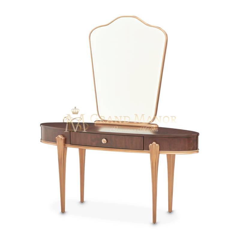 Туалетный столик Camellia Field - это воплощение элегантности и функциональности. Столешница из шпона красного дерева с теплой ореховой отделкой пекан гармонично сочетается с бархатными выдвижными ящиками и изящной ручкой в виде цветка камелии. Зеркало в старинной золотой раме придает столику особый шарм, делая его идеальным элементом вашей гардеробной.
