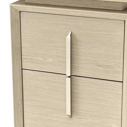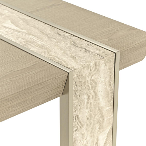 Его обтекаемый силуэт, покрытый безмятежной песочной отделкой с изысканным характером белого дуба, подчеркнут мраморной инкрустацией, которая элегантно ниспадает каскадом вдоль одной ножки, придавая ей скульптурный драматизм.