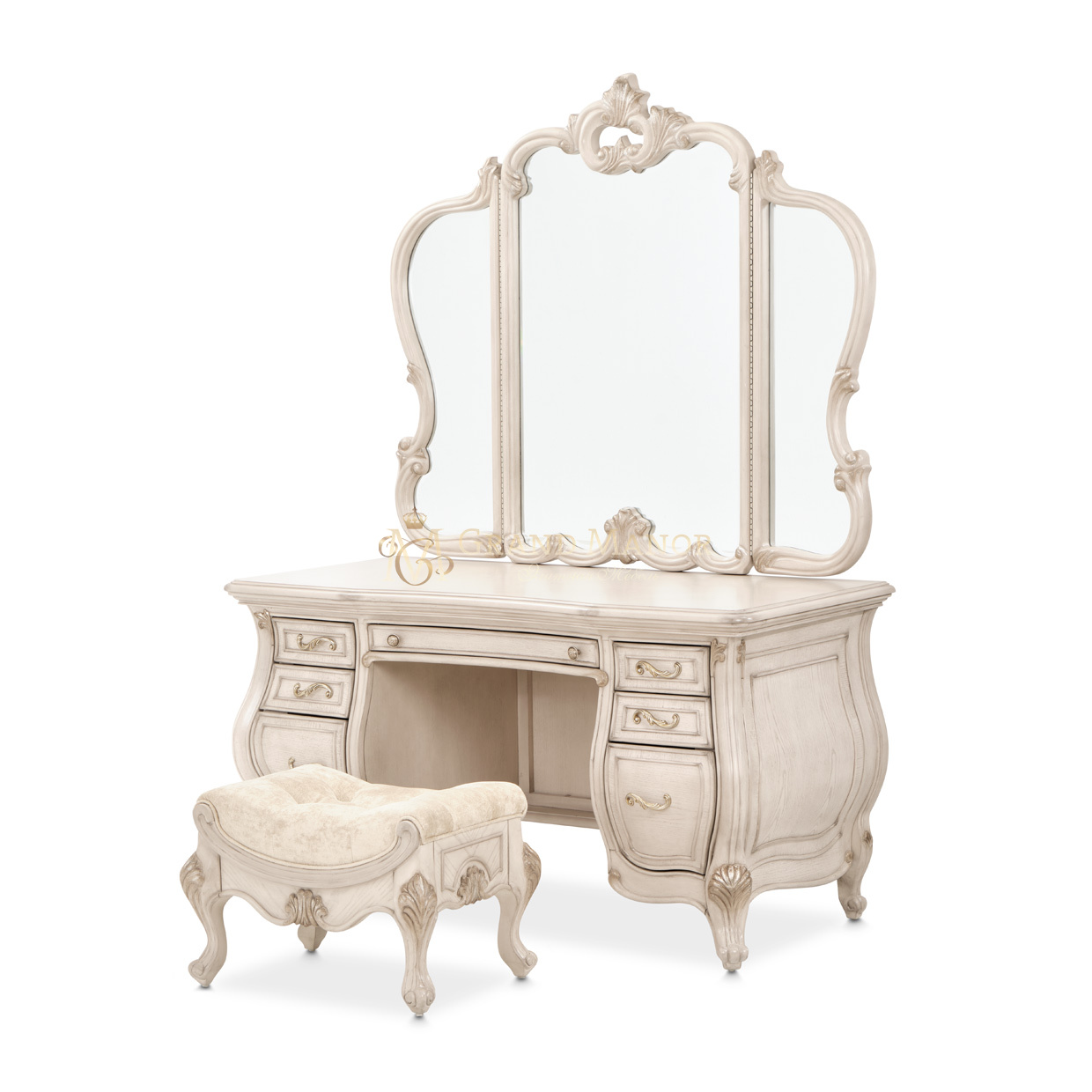 Замысловатые детали в сочетании с изогнутым дизайном этого туалетного столика создают вневременной вид, который по-настоящему излучает роскошь. Благодаря шести отделанным бархатом ящикам по бокам, здесь достаточно места для хранения всех ваших вещей. Кроме того, лоток для украшений посередине гарантирует, что вы сможете безопасно хранить все свои украшения, сохраняя их в легкодоступном месте. Наконец, вы можете еще раз проверить свой внешний вид в красивом зеркале на петлях с тремя панелями, сидя на великолепной банкетке.