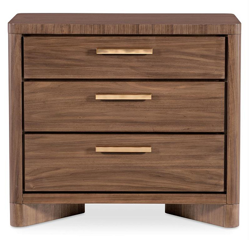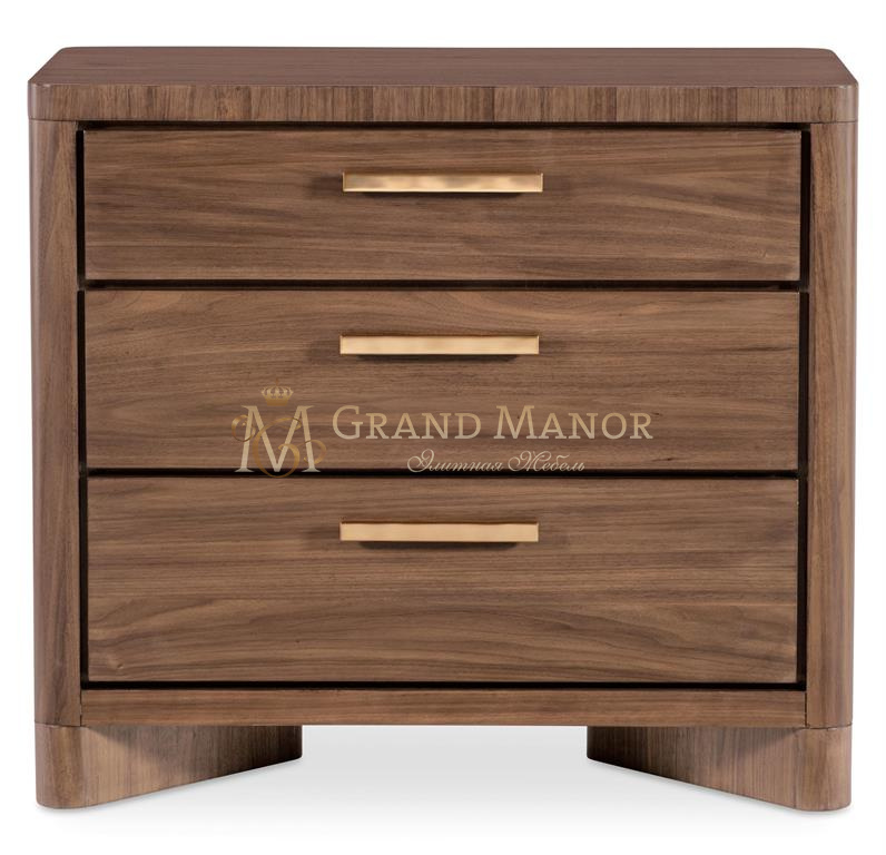Прикроватная тумбочка Eleana с тремя выдвижными ящиками, созданная для удобства и стиля, отделана светло-карамельным шпоном орехового дерева, фурнитурой из бронзы с покрытием и закругленными углами. Встроенная зарядная станция с двумя розетками и тремя самозакрывающимися выдвижными ящиками делают ее функциональной и роскошной для хранения у кровати.
