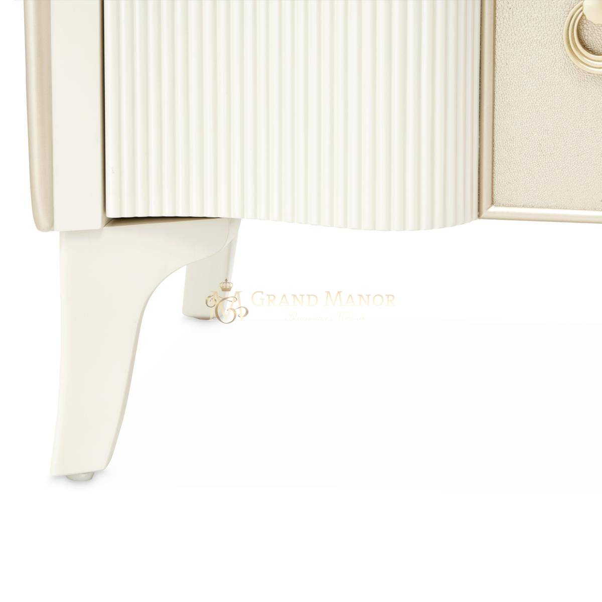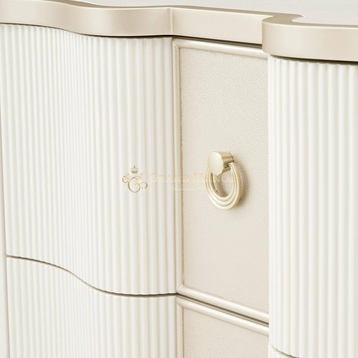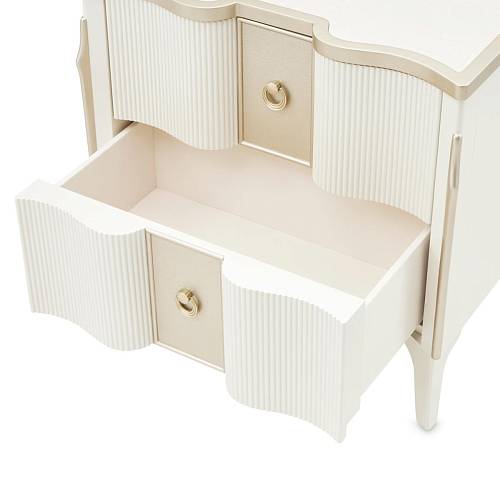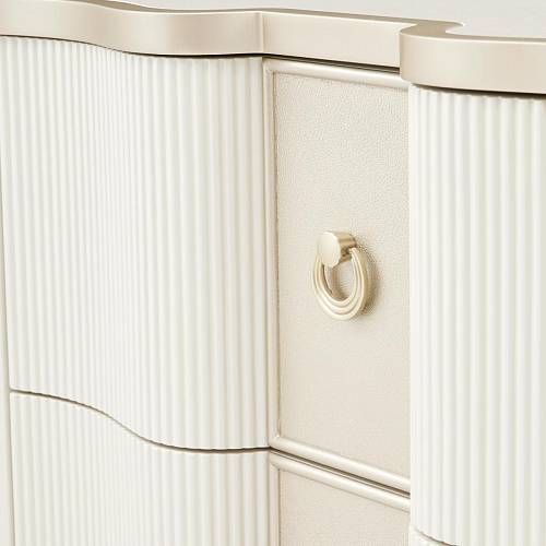 Текстурированные панели выдвижных ящиков из искусственной шагрени создают насыщенный тактильный контраст с мягкими ребристыми боковыми панелями, создавая динамичный визуальный эффект. Два бархатных ящика плавно выдвигаются благодаря механизмам мягкого закрывания, обеспечивая как функциональность, так и изысканность.