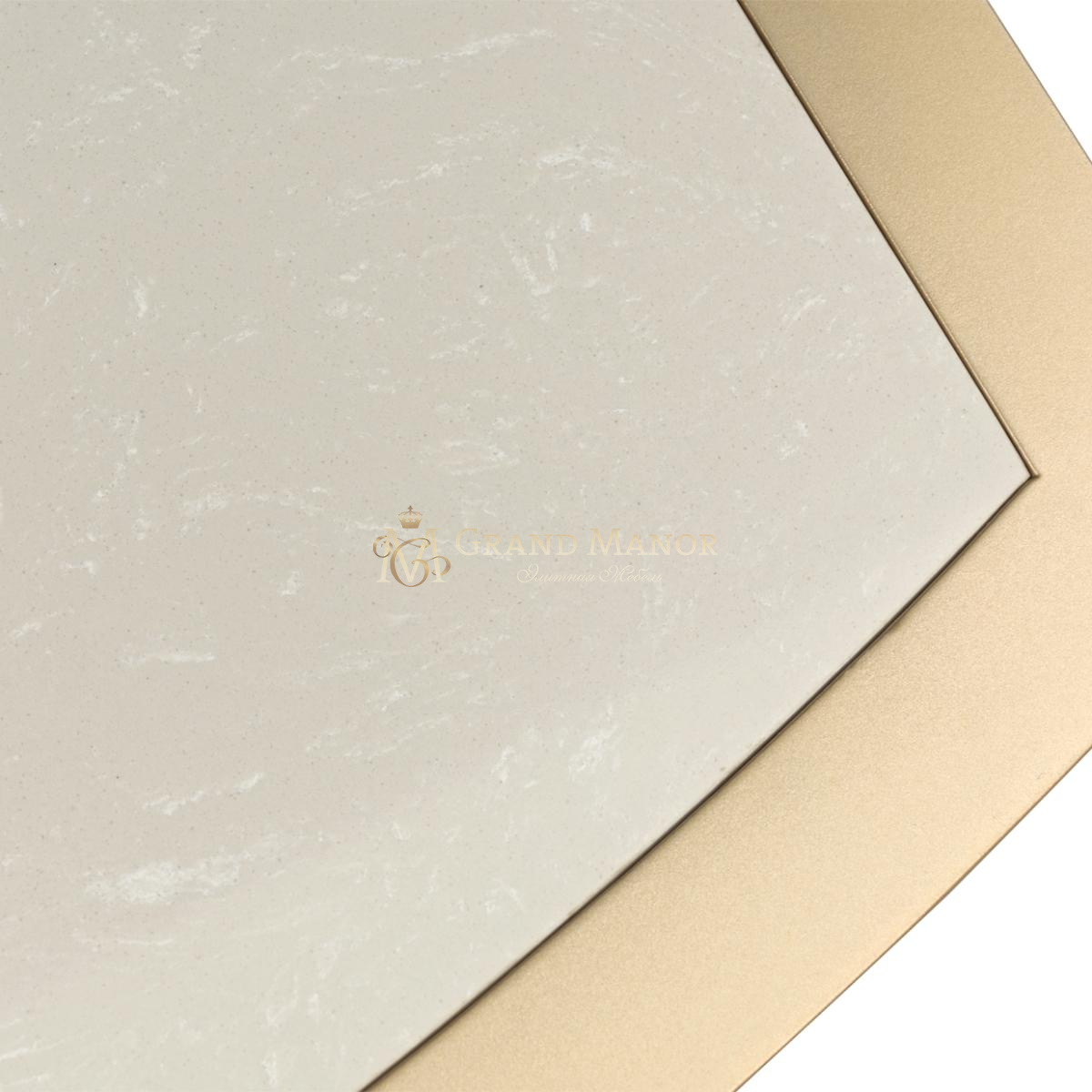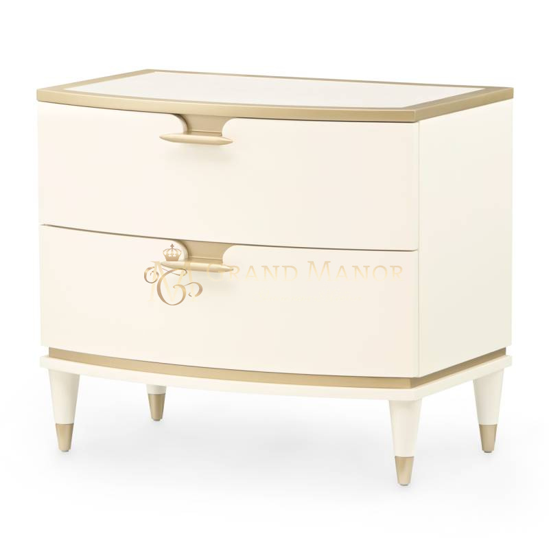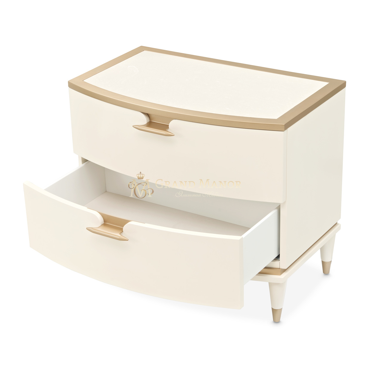 Прикроватная тумбочка La Terrazza Large — это элегантное и вместительное решение для спальни. Ее скульптурный силуэт, выполненный в кремово-жемчужном цвете, обрамлен роскошной золотой отделкой, которая изящно подчеркивает каждый изгиб. Полированная столешница из искусственного мрамора предоставляет достаточно места для хранения светильников, декора и необходимых мелочей. Внизу расположены два вместительных выдвижных ящика с элегантной золотой фурнитурой и бархатным дном, что добавляет тумбочке особый шарм.