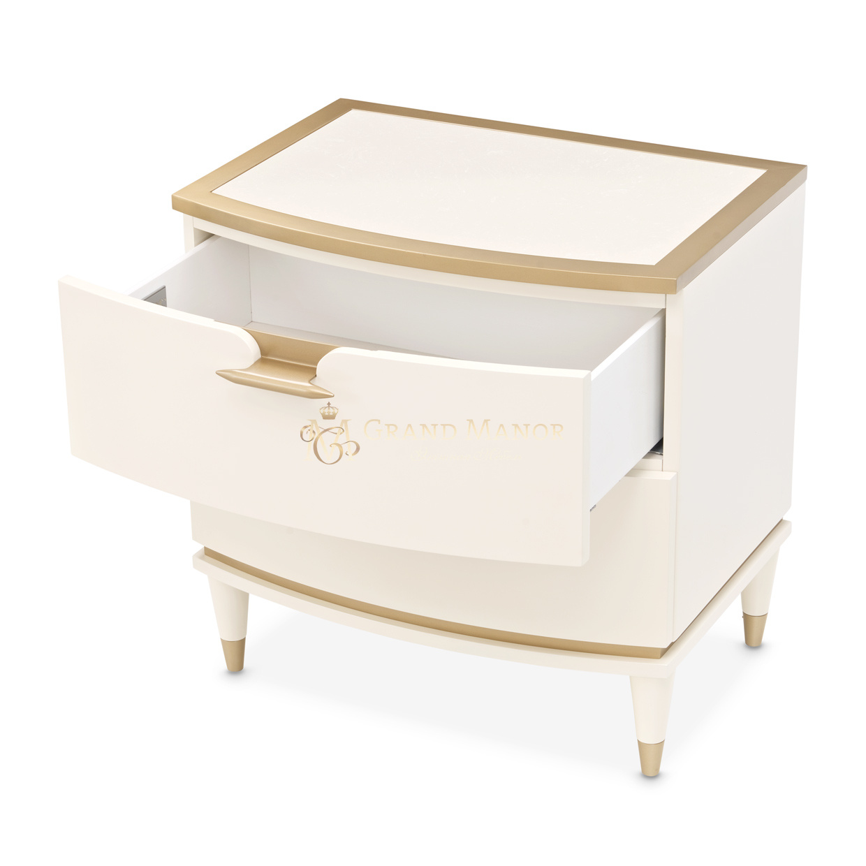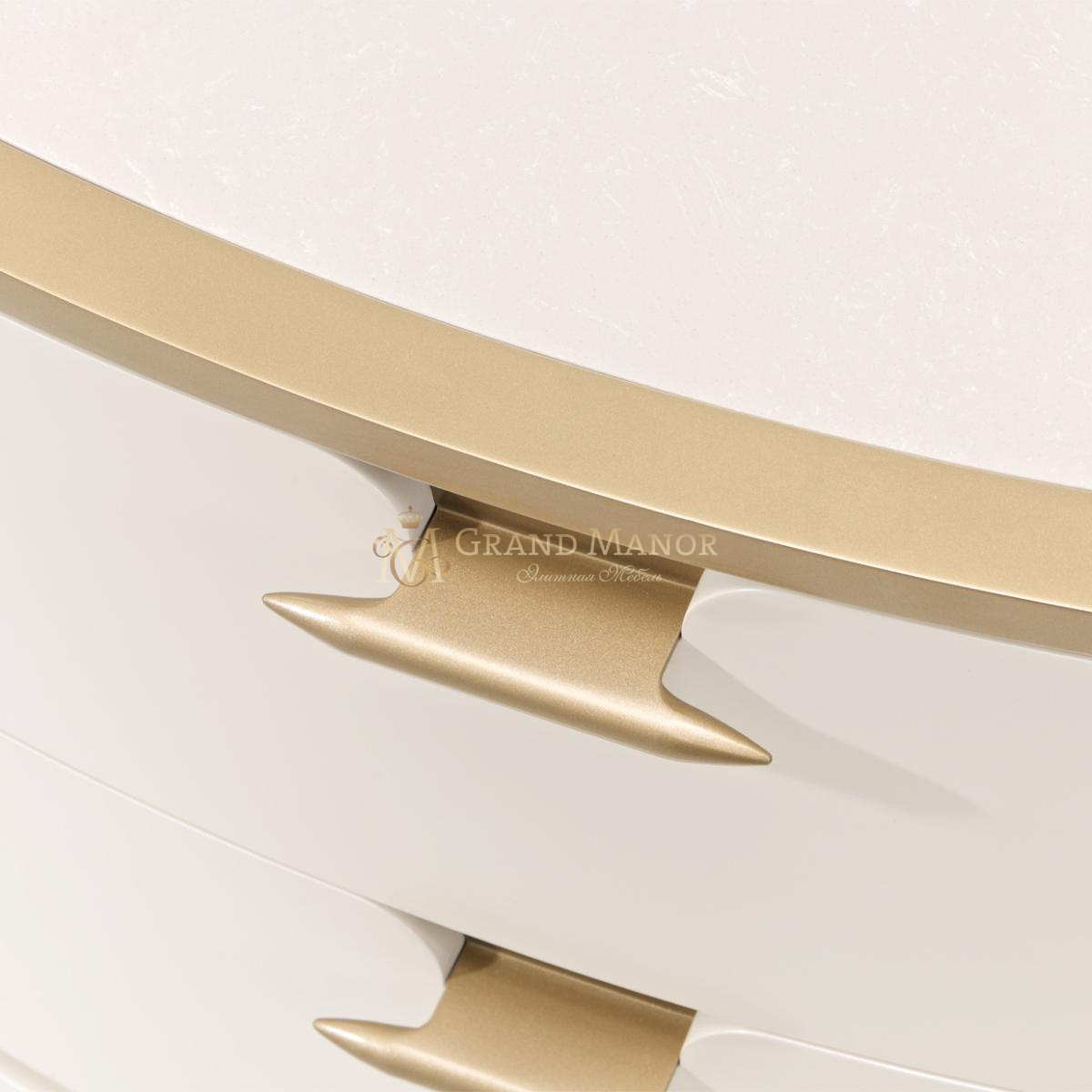 Миниатюрная по размерам, но, несомненно, эффектная, тумбочка La Terrazza Small придает скульптурную элегантность любому прикроватному пространству. Ее изящно изогнутый силуэт выполнен в сияющем кремово-жемчужном тоне, красиво обрамленном богатой золотой отделкой, подчеркивающей каждый контур. Поверхность изготовлена из культивированного мрамора — холодного, полированного, идеально подходящего для эффектных светильников и изысканного декора. Два вместительных ящика легко открываются благодаря механизмам плавного закрывания и изящной золотой фурнитуре. Внутри — бархатная подкладка, создающая уютное место для хранения ночных принадлежностей.