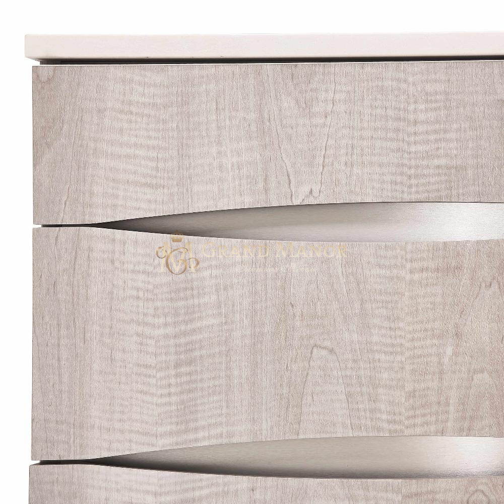 Прикроватный столик Marin отличается простотой, но элегантностью, благодаря столешнице из искусственного мрамора и вставкам из нержавеющей стали. Три обшитых бархатом выдвижных ящика с самозакрывающимися планками - идеальное место для удобного хранения у кровати.