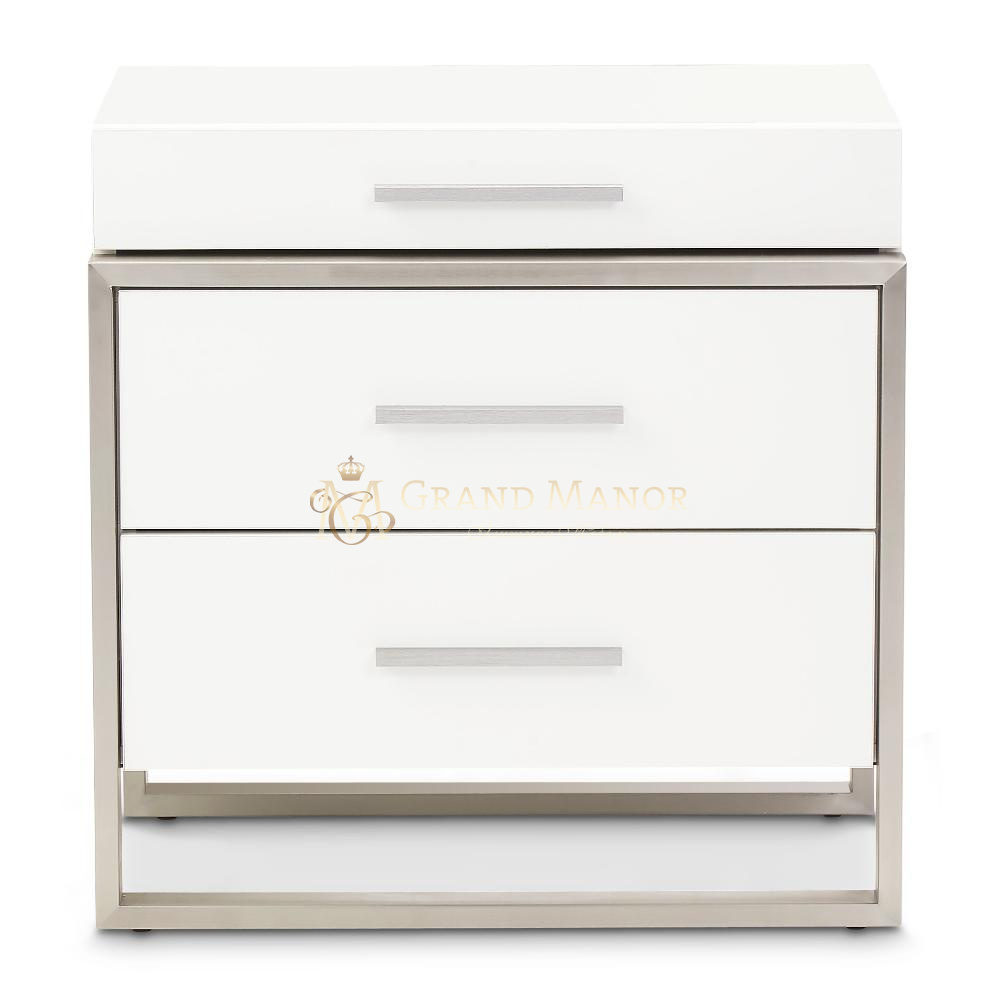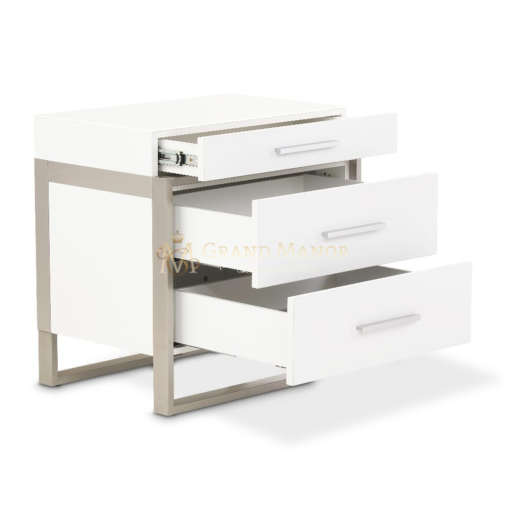 Выбирайте уникальное. Прикроватная тумбочка Marquee - это баланс между формой и асимметрией. Благодаря раме из нержавеющей стали со смещенным краем и многоуровневому верхнему ящику вы получаете яркий современный вид с освежающей изюминкой.