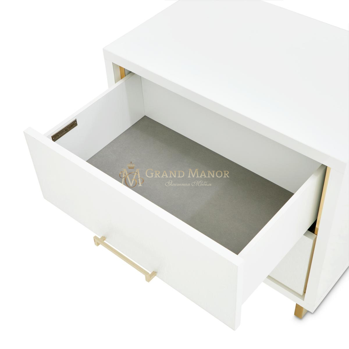 Прикроватная тумбочка Palm Gate сочетает в себе функциональность и элегантность. Благодаря золотым вставкам, продуманно расположенным ручкам и двум отделанным бархатом выдвижным ящикам, размещенным в безупречном акриловом корпусе, она станет стильным дополнением к спальне.