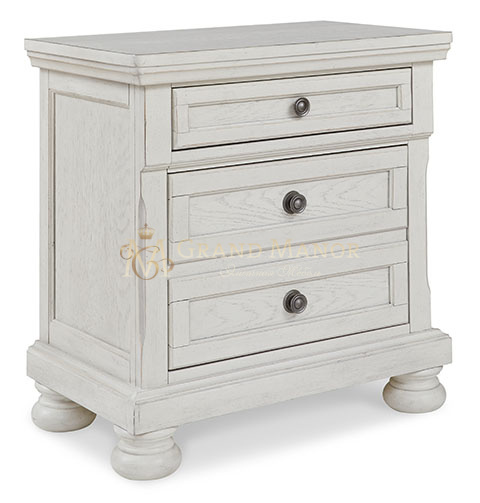 Белая отделка под старину с прекрасной зернистой текстурой излучает изысканность, а фурнитура темного бронзового цвета добавляет стиля.