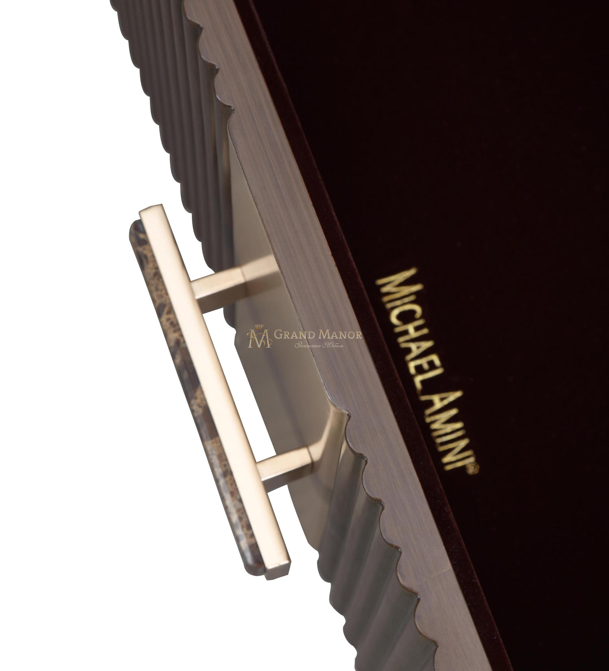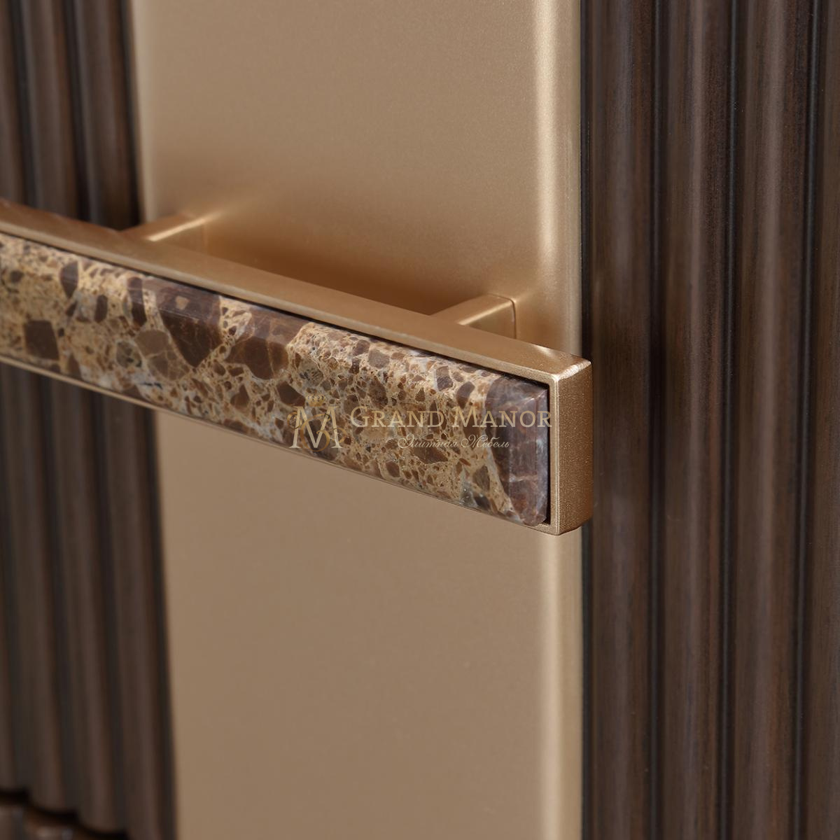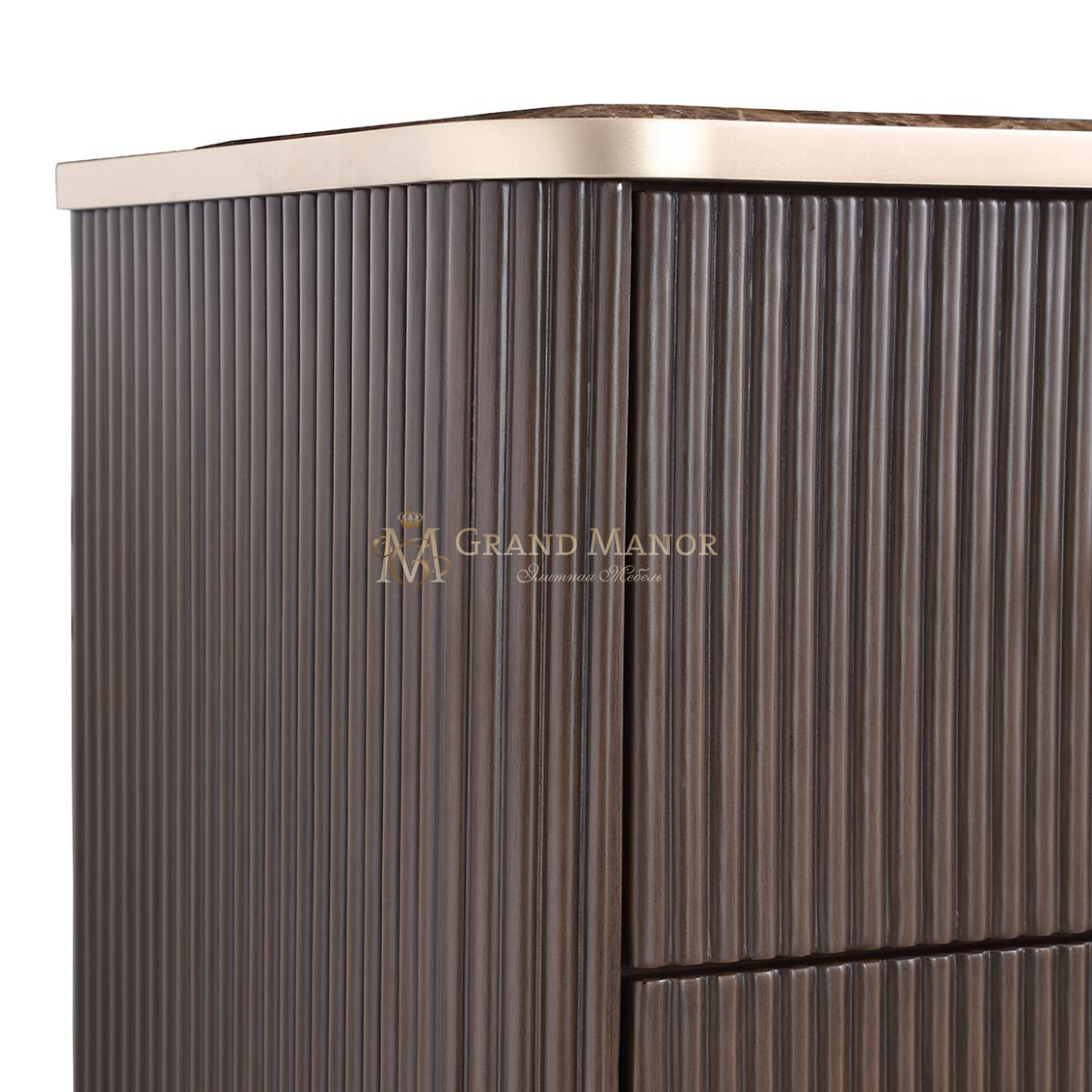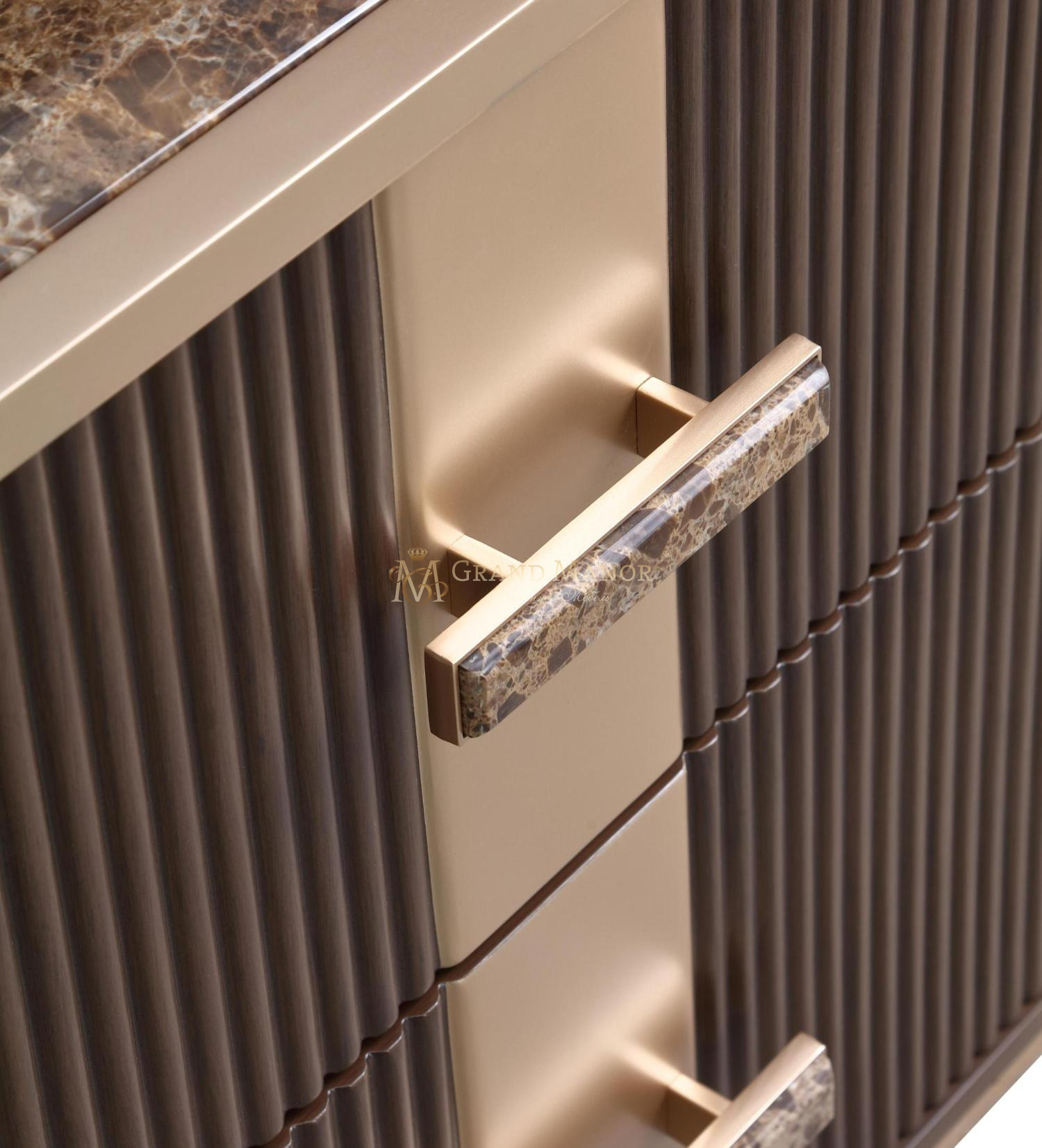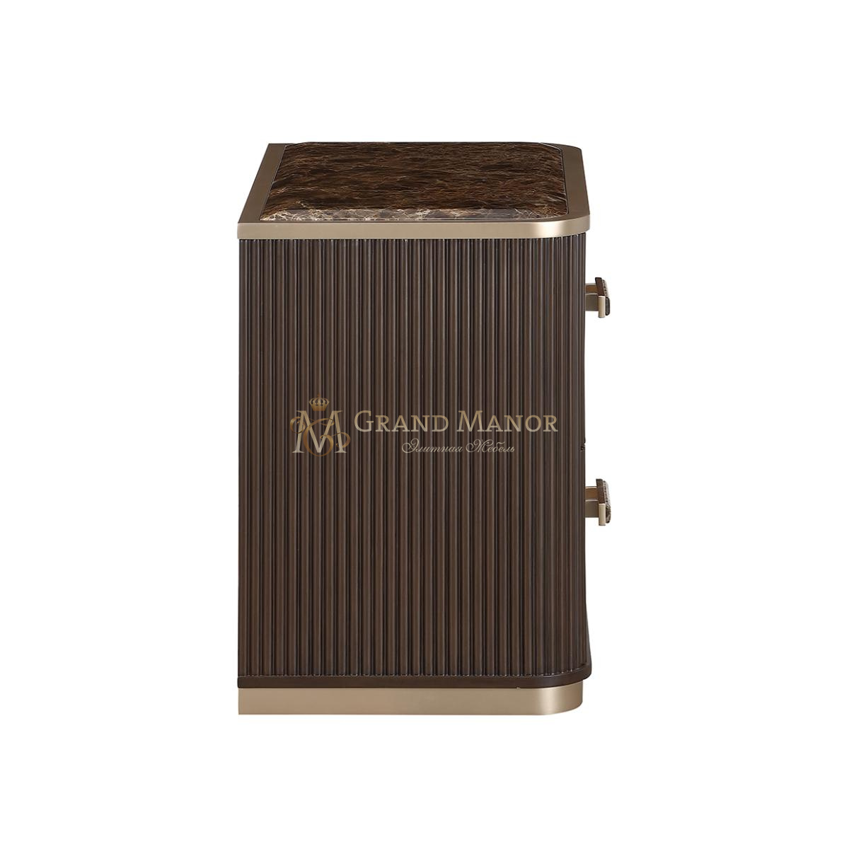 Ее скульптурная форма, выполненная из ридинга цвета кофе-эспрессо, увенчана потрясающей столешницей из мрамора Emperador, излучающей роскошь. Позолоченные вставки создают яркий контраст, подчеркивая великолепие прикроватной тумбочки.