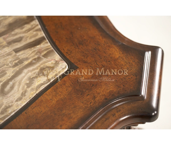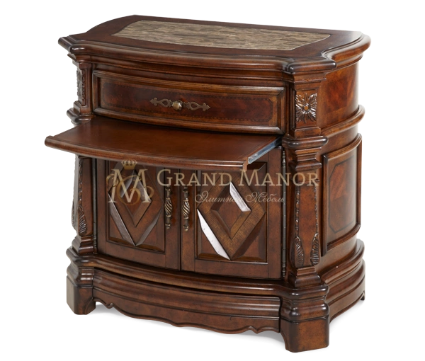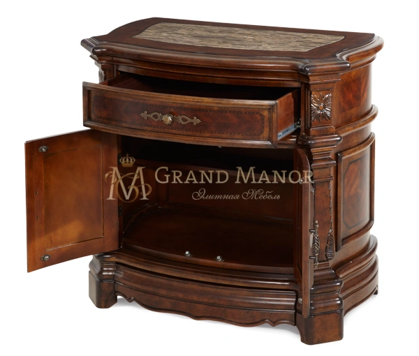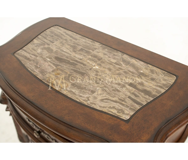 Прикроватный столик с мраморной столешницей, искусно вырезанным деревом и изящными украшениями.