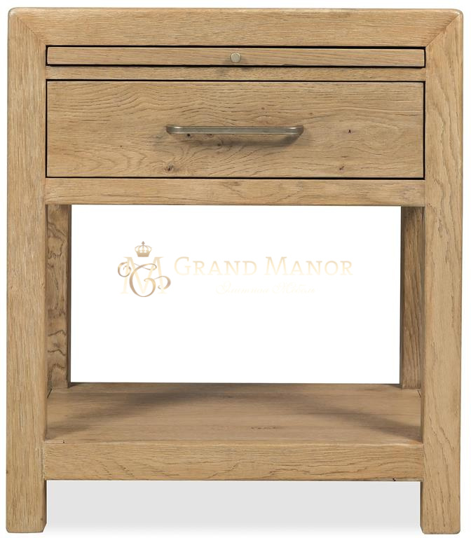 Прикроватная тумбочка Driftwood с одним выдвижным ящиком из массива дуба теплого, выцветшего на солнце оттенка, оснащена самозакрывающимся ящиком, выдвижной полкой и фиксированной нижней полкой. Встроенный зажим для шнура обеспечивает удобство размещения прикроватной электроники.