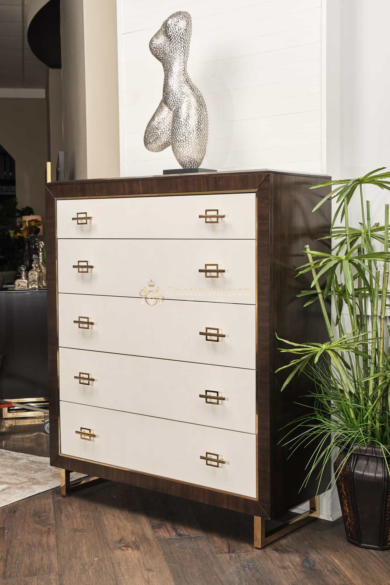 Комод, инкрустированный белой шпонированной инкрустацией анегри и стоящий на изящных ножках, является воплощением дизайна и мастерства.