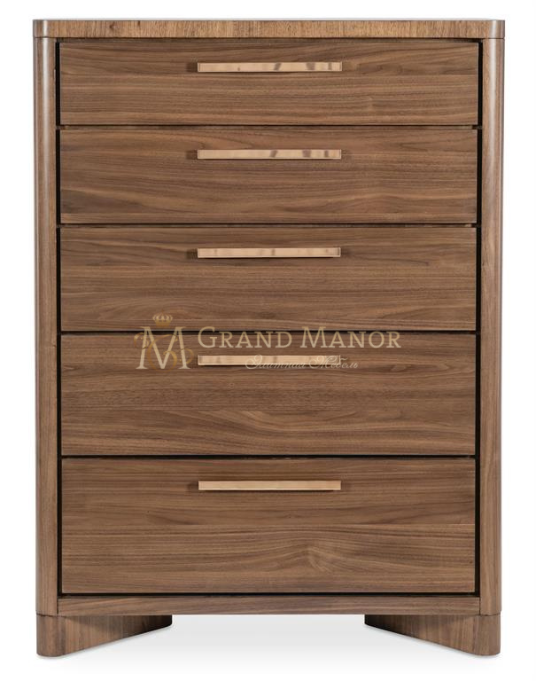 Благодаря пяти самозакрывающимся выдвижным ящикам и нижнему ящику, облицованному кедром, в нем достаточно места для хранения вещей, при этом он имеет изящный скульптурный профиль. Это идеальное дополнение к любой спальне переходного периода.