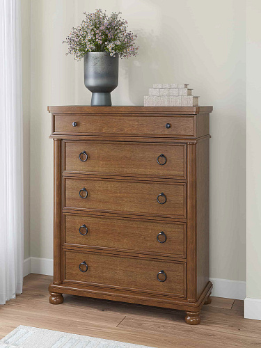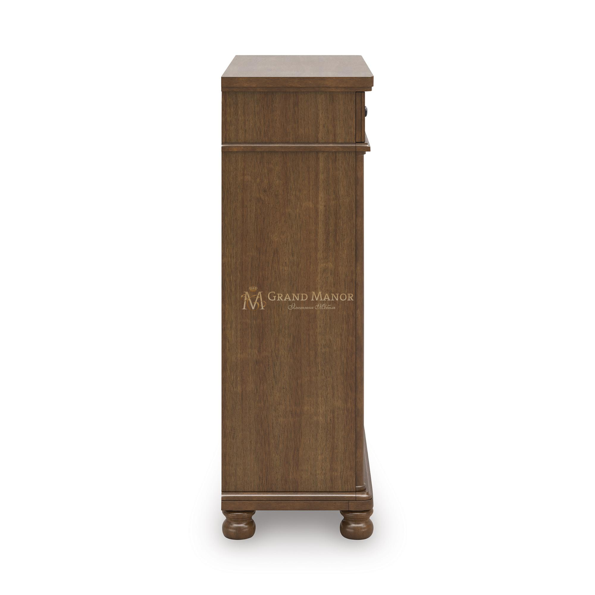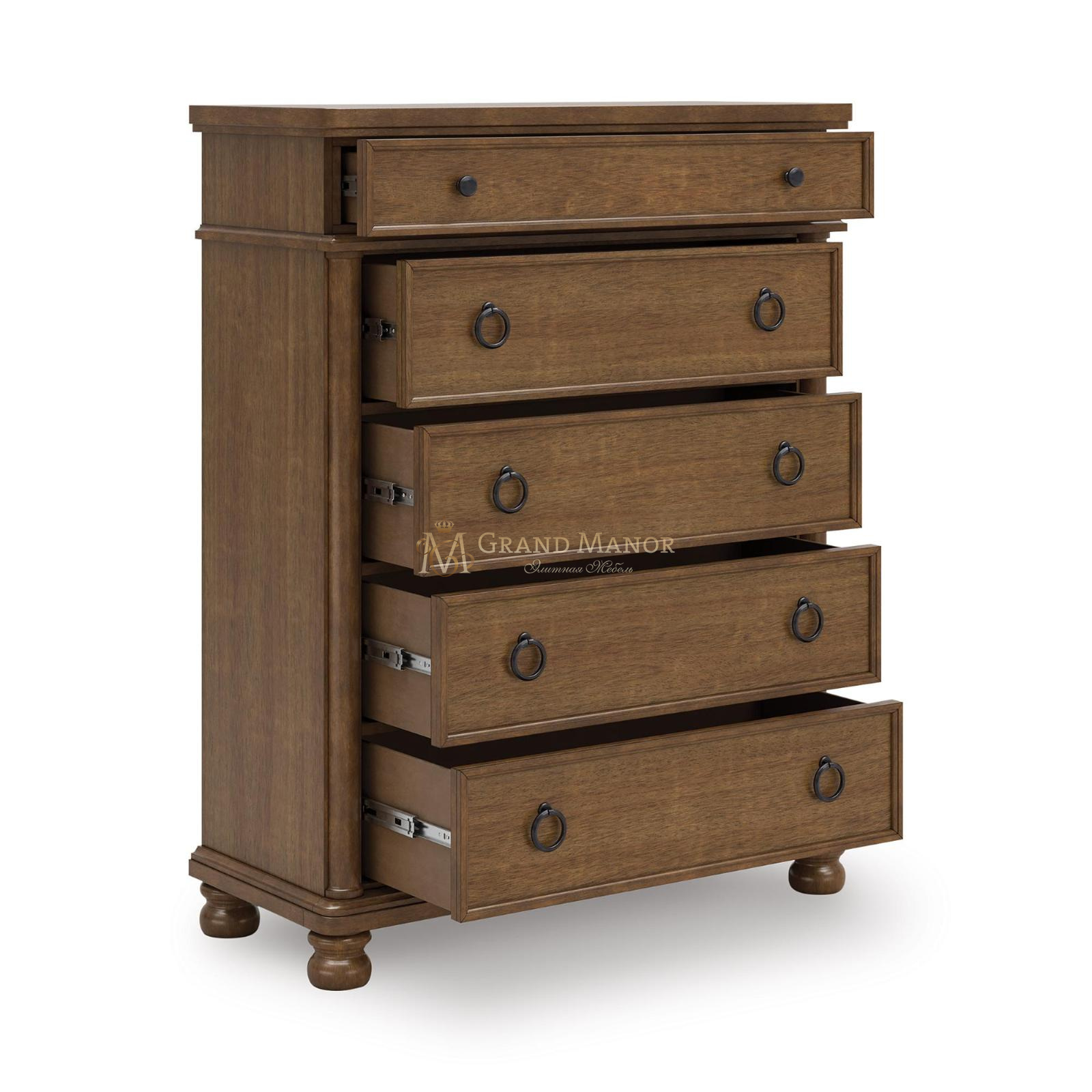 Этот искусно выполненный комод в непринужденном традиционном стиле сочетает в себе классические элементы и лаконичный современный дизайн. Его насыщенный средне-коричневый оттенок дерева излучает уютную, неподвластную времени атмосферу, которая перенесет вас в сказочное время и место. Простые круглые металлические ручки и кольца на вместительных ящиках комода выглядят очень стильно.