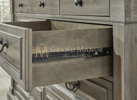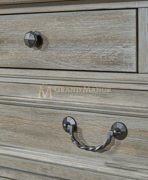 Фурнитура цвета черного железа украшает фасады ящиков, придавая этому шикарному предмету атмосферу традиционной элегантности.