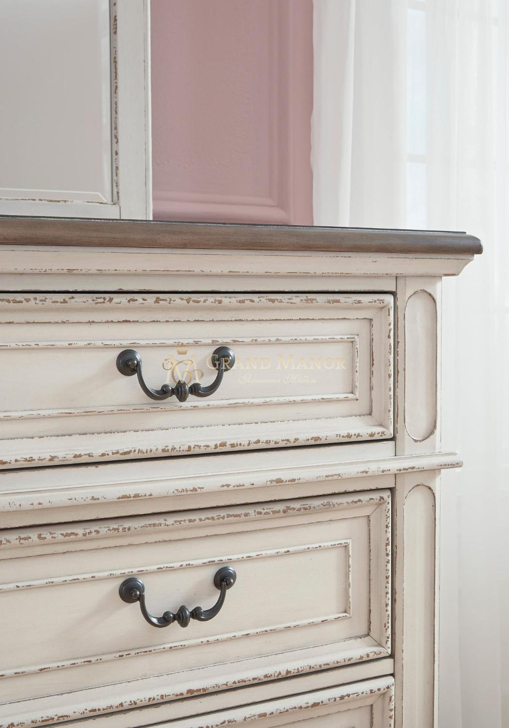Возвышая искусство традиционного загородного стиля, этот комод станет воплощением вашей мечты о спальне. Двухцветная эстетика под старину сочетает в себе белоснежный цвет с отделкой из состаренного дерева для дополнительного очарования. Фасады выдвижных ящиков в рамке и декоративные выступы добавляют изысканности, а ручки с отделкой темного бронзового оттенка придают классический вид.