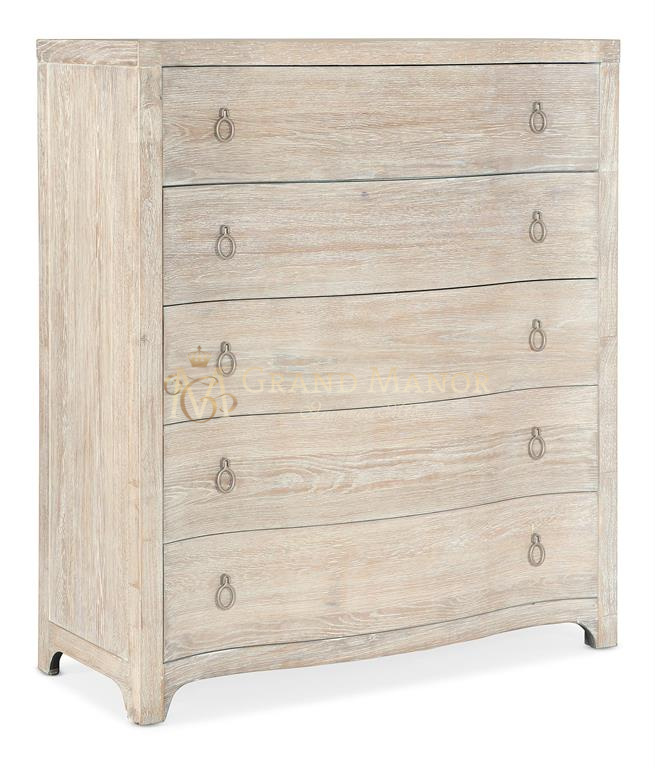 Если вы предпочитаете спокойные палитры и текстуры, комод Serenity Monterey создаст атмосферу умиротворения благодаря легкой и воздушной отделке Surf, выполненной поверх дубового шпона. Он оснащен 5 вместительными выдвижными ящиками, верхний из которых имеет съемную подкладку из черного войлока, а нижний отделан кедром. Легкие кольца цвета шампанского придают ему блеск.