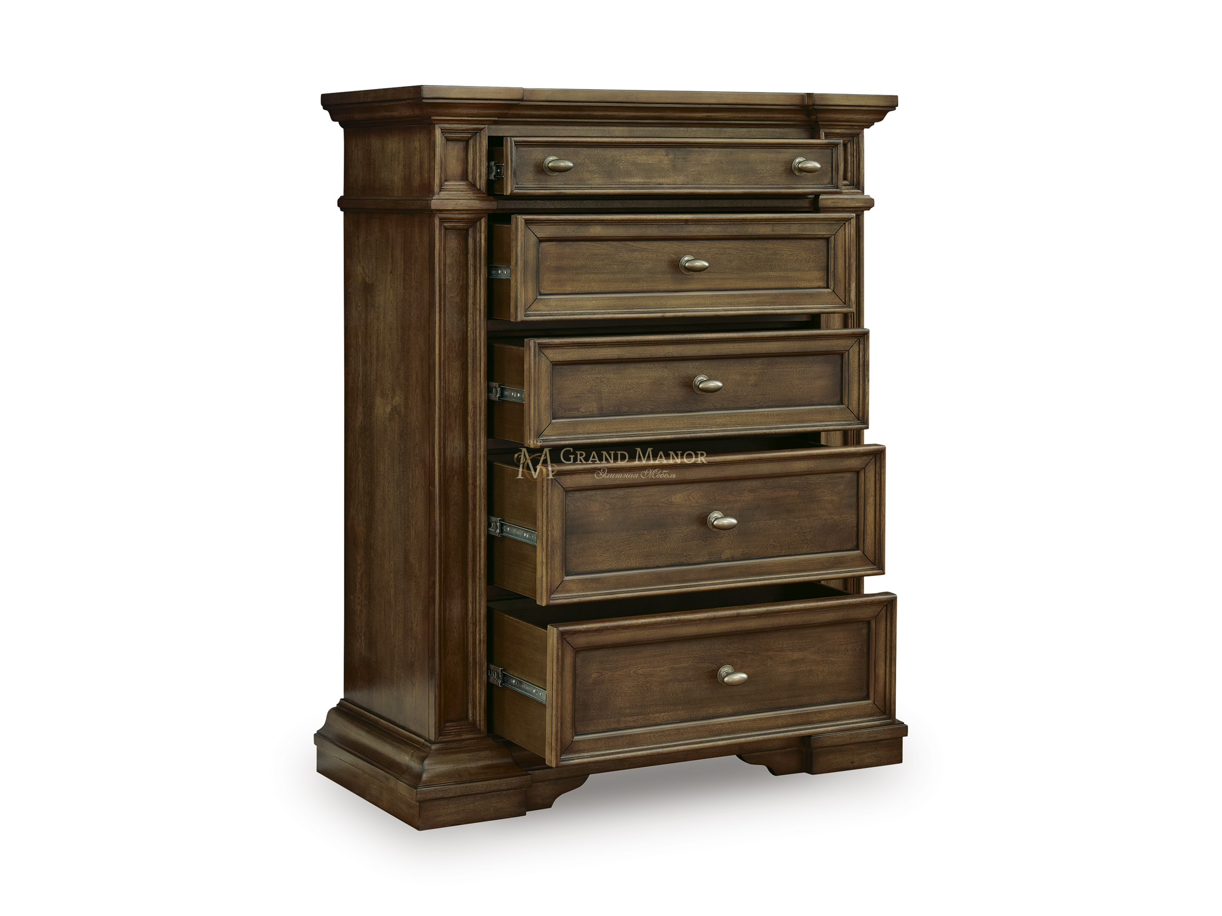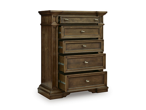 5 плавно выдвигающихся ящиков с полностью отделанным внутренним пространством, конструкцией «ласточкин хвост» и сверхпрочными боковыми направляющими на шарикоподшипниках.